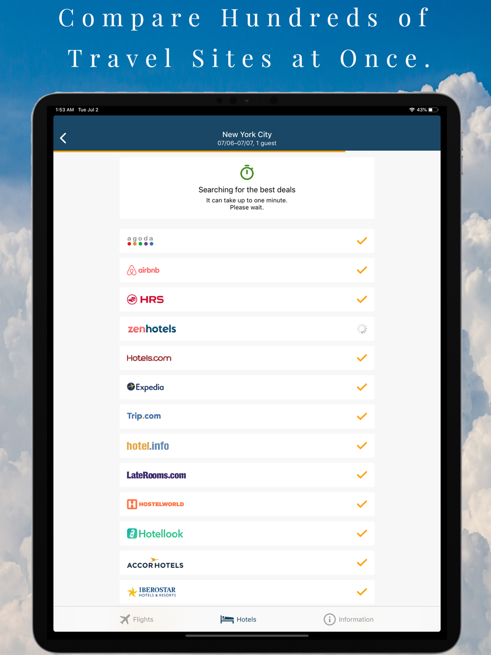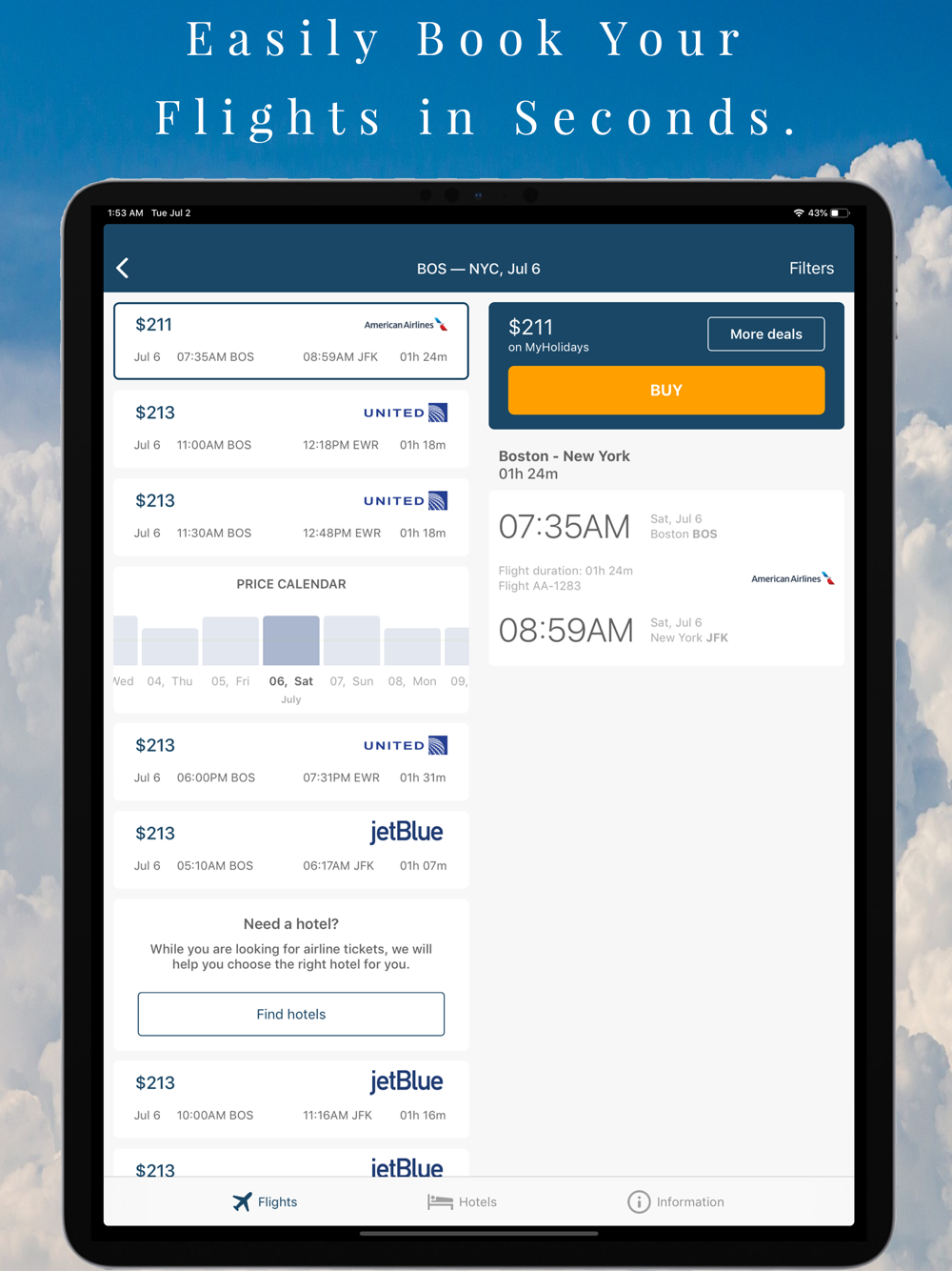 • Comprehensive Search Engine: Compare offers from 1,038 regular, charter and low-cost airlines (including American Airlines, Frontier Airlines, Hawaiian Airlines, JetBlue Airways, Southwest Airlines, Spirit Airlines and United Airlines) in addition to hundreds of travel agencies and booking systems.