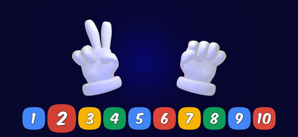 The child can interact with the app by tapping the numbers or swiping through the animations. If there is no interaction from the user, the hands will automatically count up to ten. The 3D hands are modeled after common cartoon characters. This design was important as it kept children engaged more than realistic hands. The playful animations mimic those of a TV cartoon while demonstrating how to count.