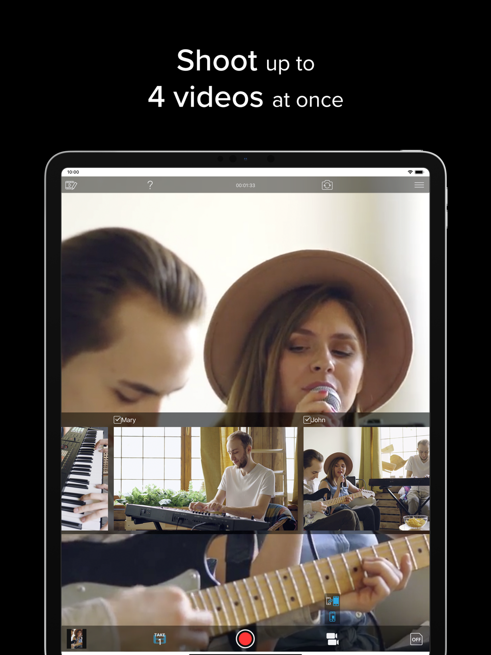 Capture up to four different camera angles simultaneously by connecting your iPhone or iPad and up to three additional iOS devices. Combine wide shots of the entire band with close-up shots of each member for impressive, dynamic results. And since all cameras are controlled by your iOS device, you can shoot a multi-angle video in one take, all by yourself.
