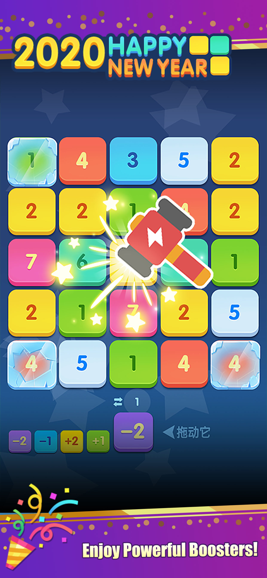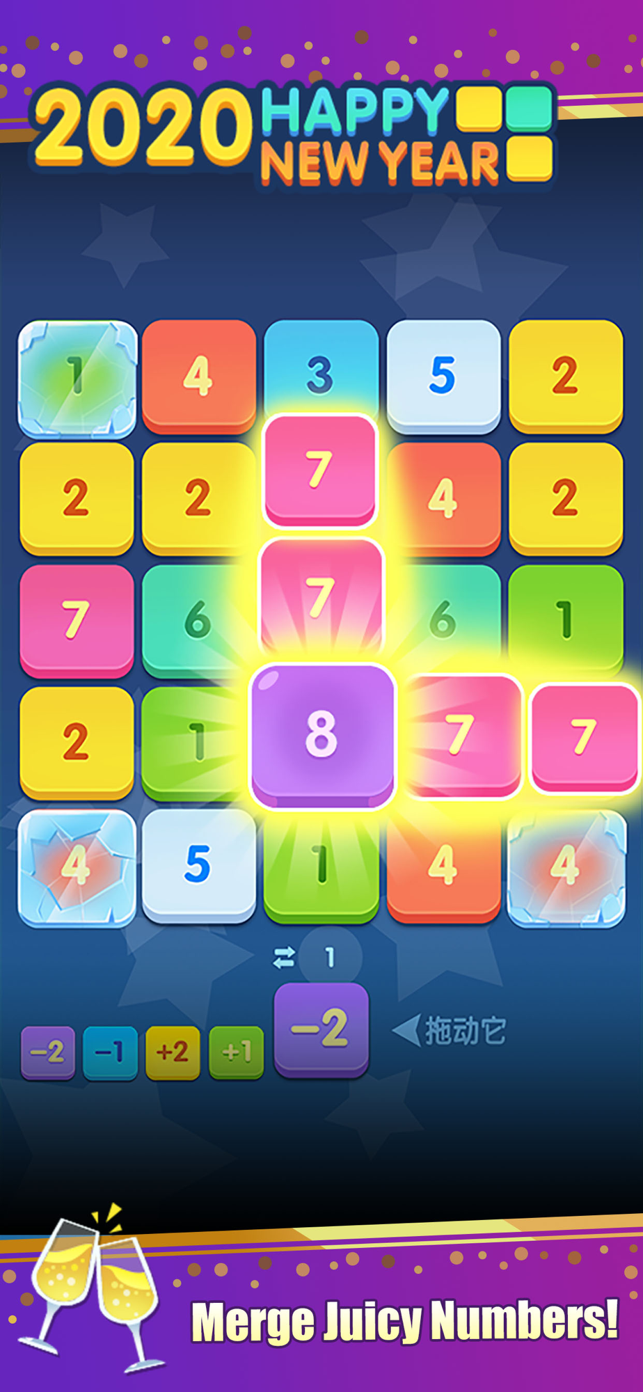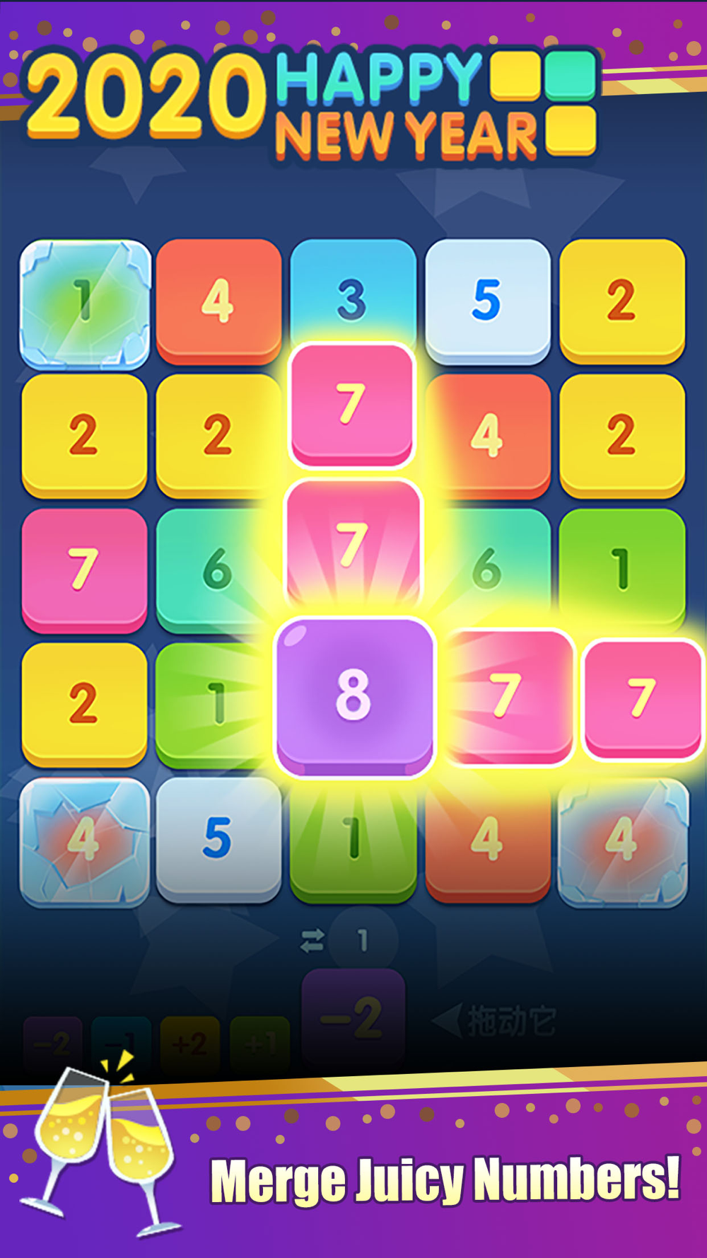 At this time, we continue to do a basic game play like Merge plus: Drag handcard to the block on the chessboard, then, It will be merged into the Sum of the two numbers. At least 3 same adjacent numbers will complete one merge.