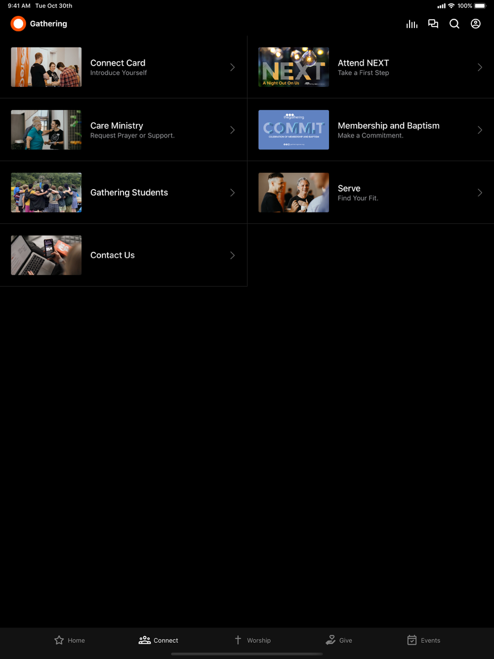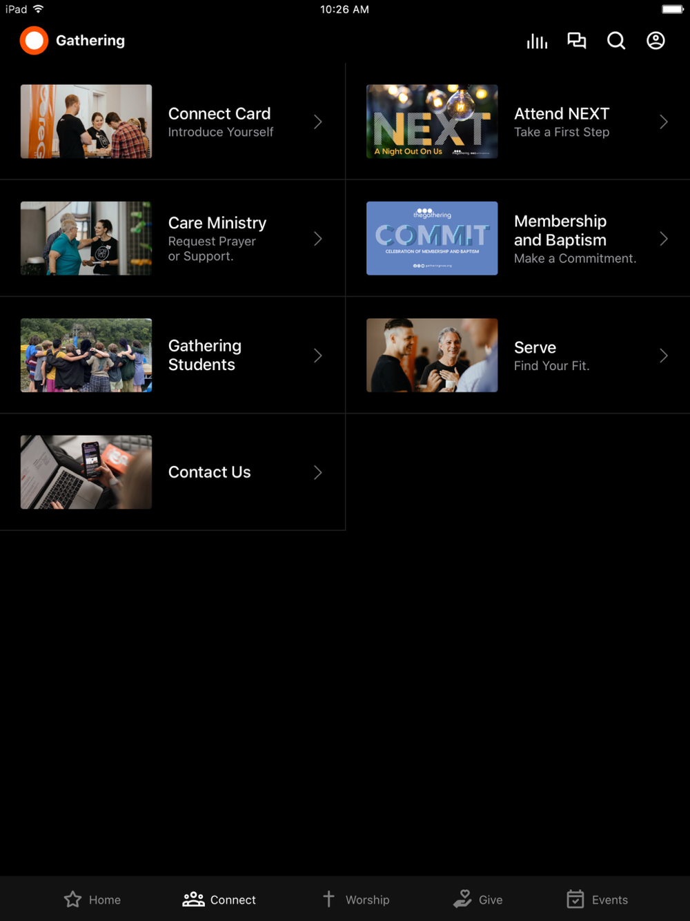 Becoming a follower of Jesus is directly related to our commitment to do the things Jesus did. The Gathering app is designed to provide RESOURCES, COACHING and ENCOURAGEMENT surrounding our shared practices of Worship, Groups, Prayer, Giving and Serving so that being led by Christ is more accessible in your daily life.