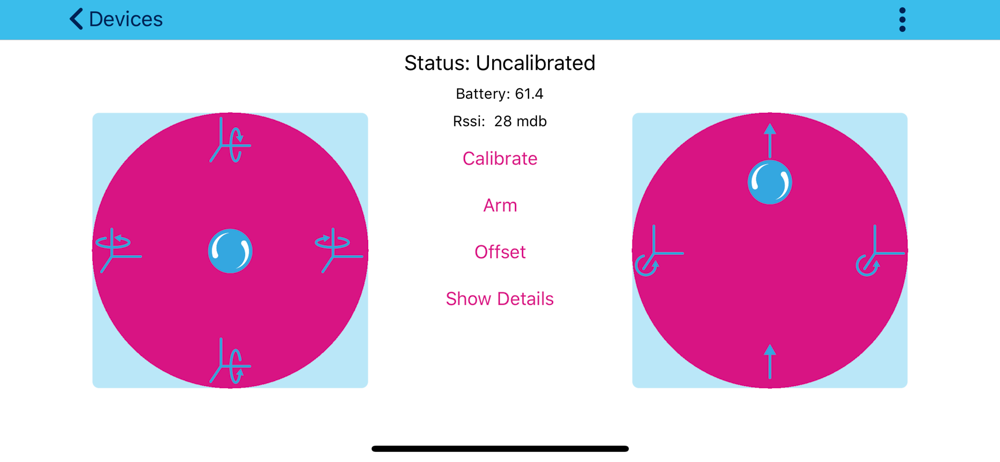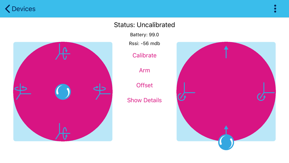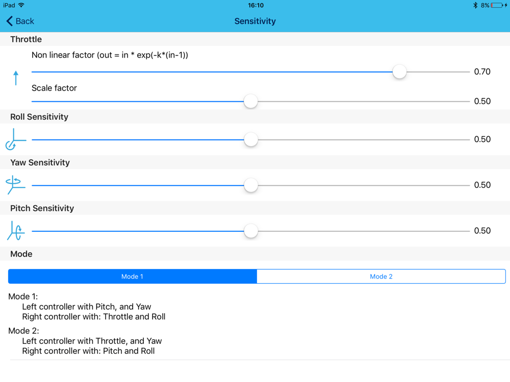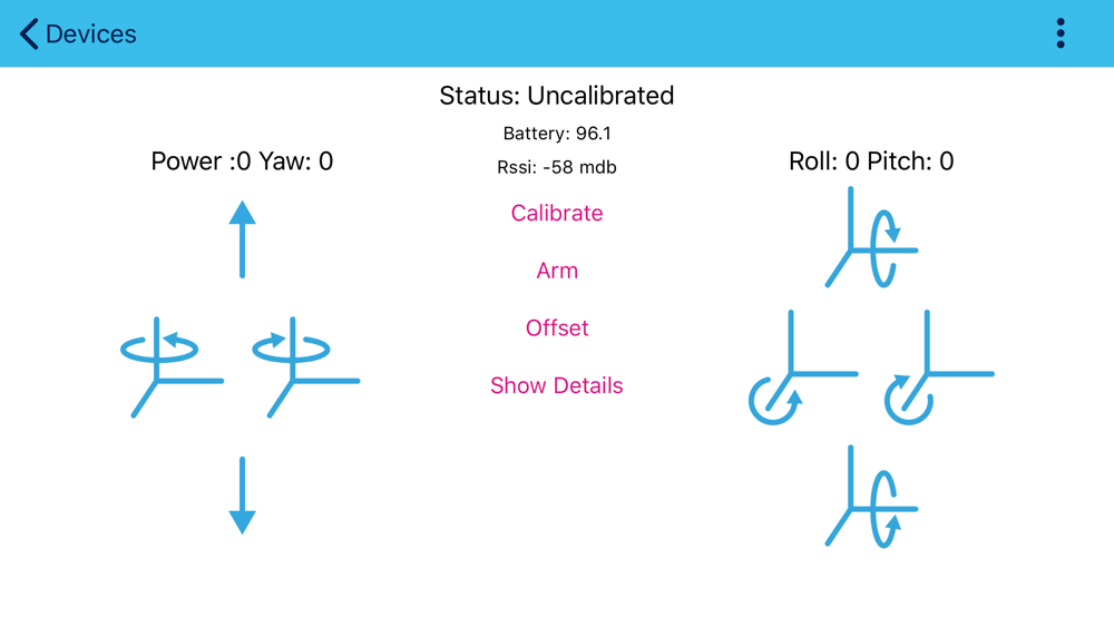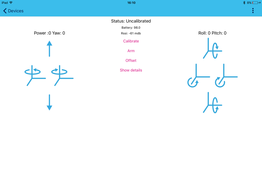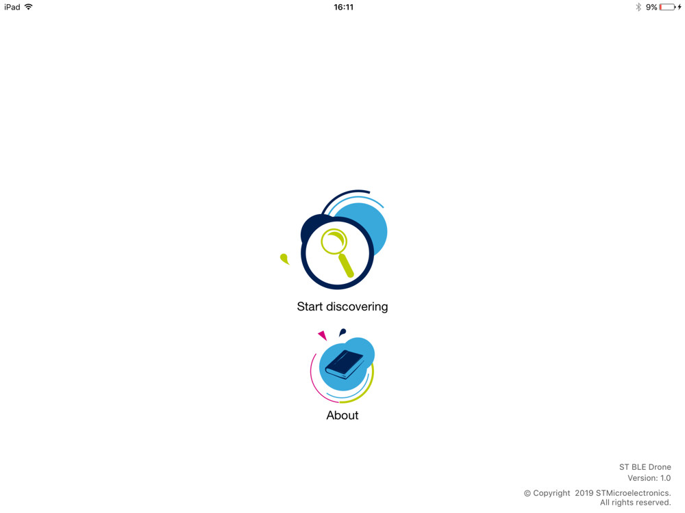 The GUI allows to pilot the ST Drone after the BLE connection has been established, then the drone is driven by touchable analog cursors.