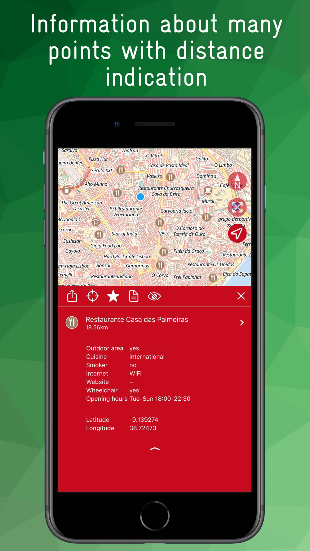 For many POIs there is further information such as opening hours, address, disabled access, ... Notes or favourites can be created for each POI, a history list shows the most recently used POIs, content can be shared.