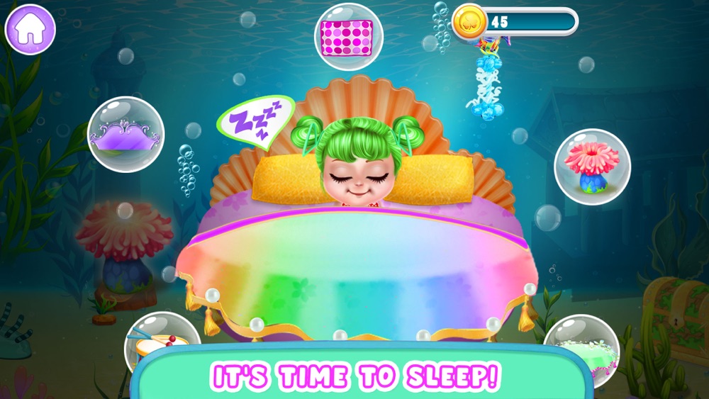 All this will lead you to earn coins so you can move forward in taking care of underwater ocean little mermaid and unlock new items and levels in the mermaid newborn baby care game.