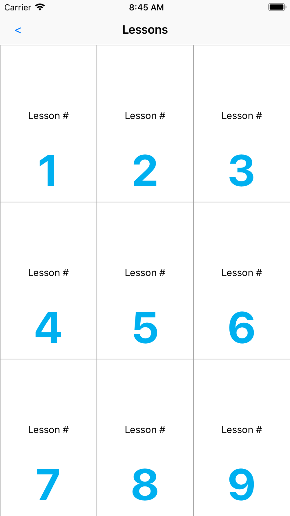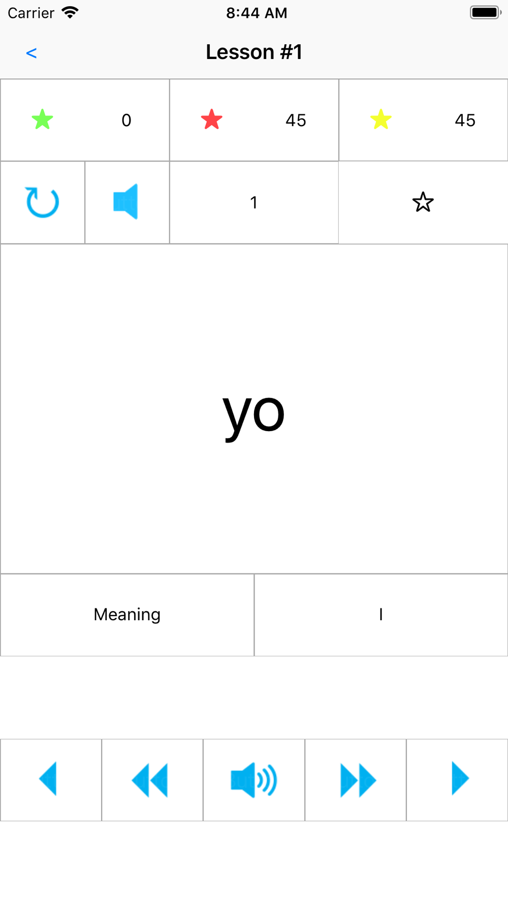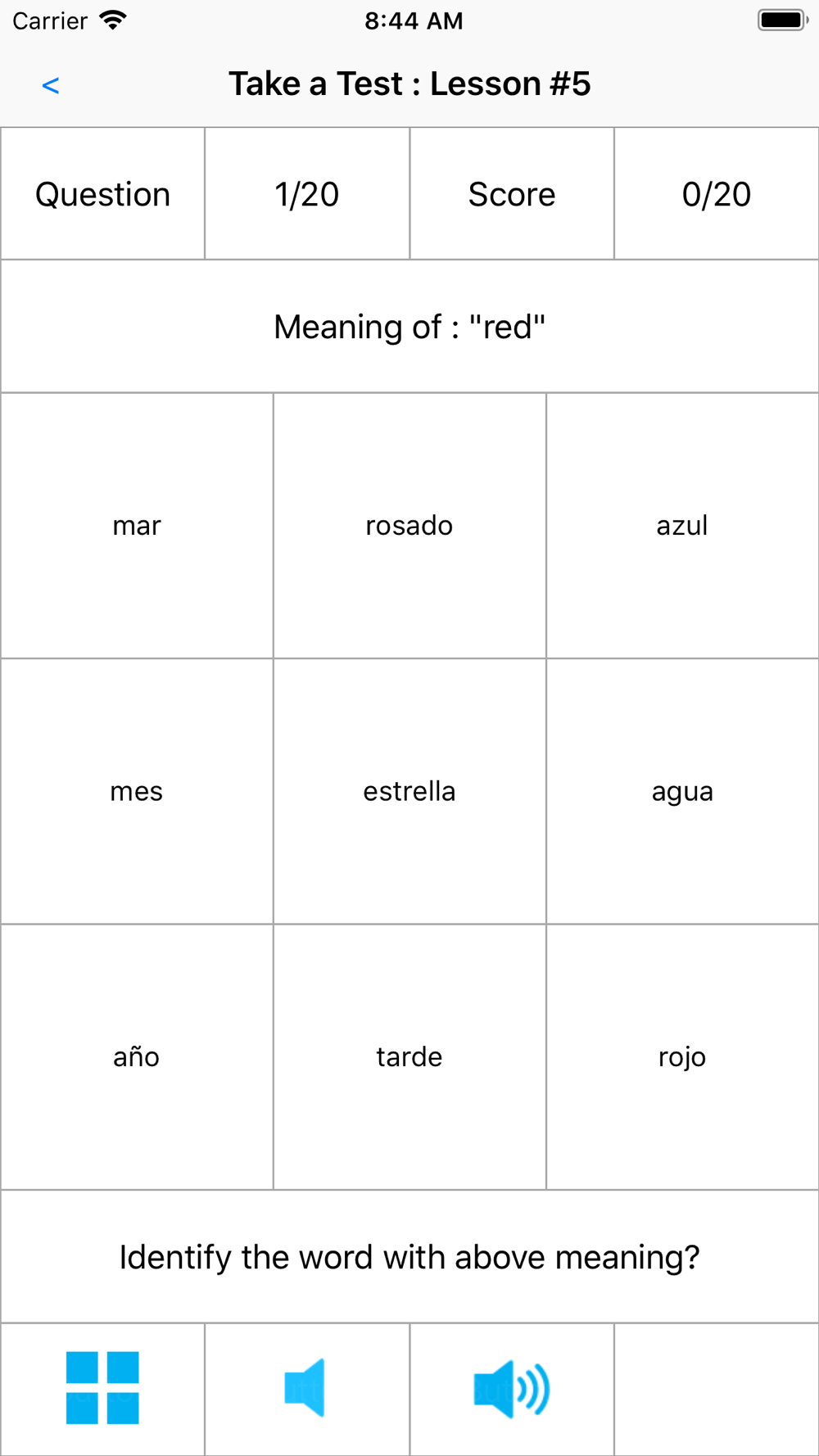Around 500+ commonly used words are provided as set of 9 lessons for learning. These words include commonly used nouns, verbs and other important words of the language. Like alphabets, a list of words with meaning are provided for comprehension. Individual words can be learned as lessons with meaning and pronunciation. Audio of pronunciation is provided to learn seeking of words. Users can mark words that are already learned to speed up learning. A quiz with random questions from a lesson is provided to check understanding.