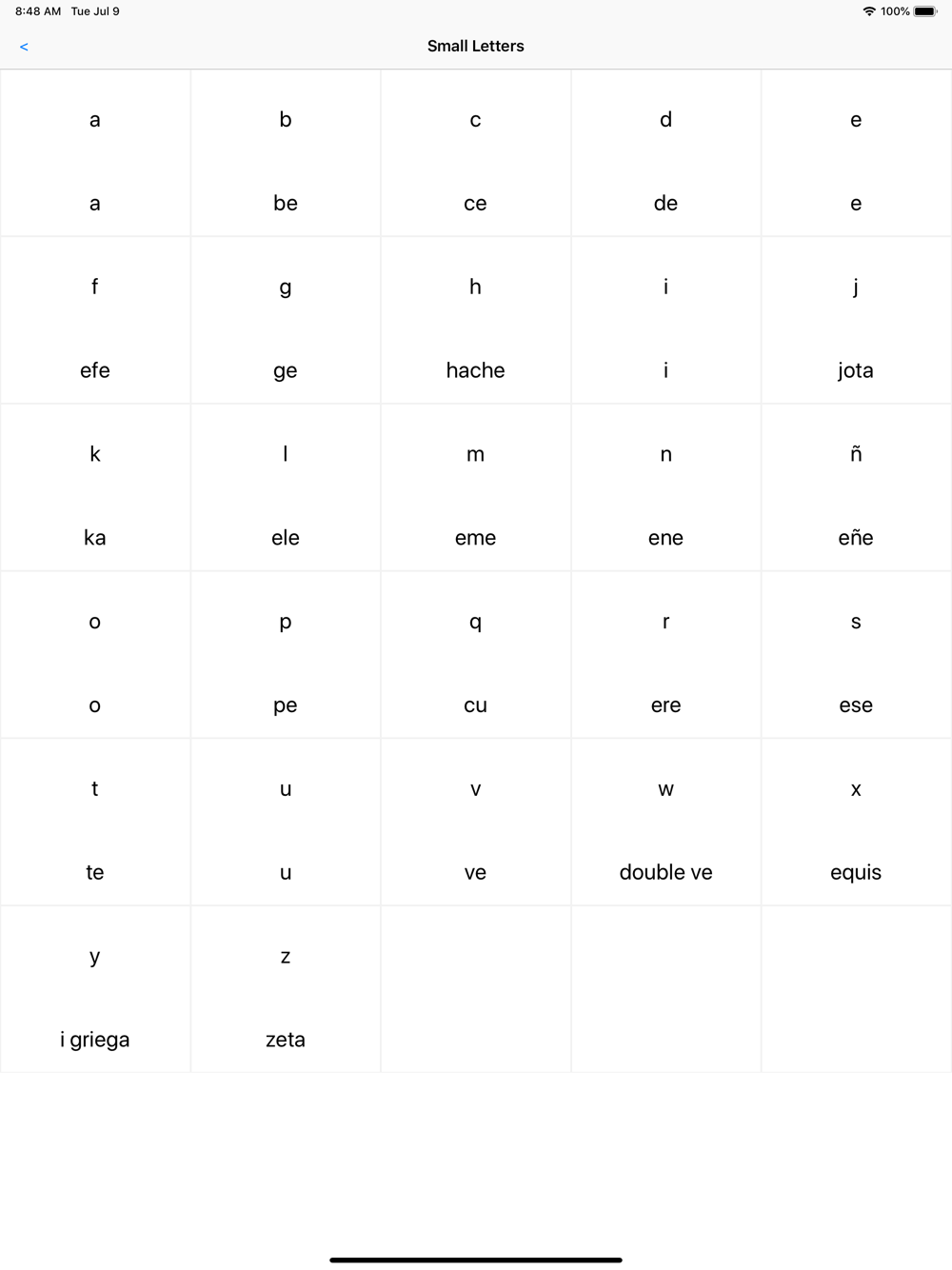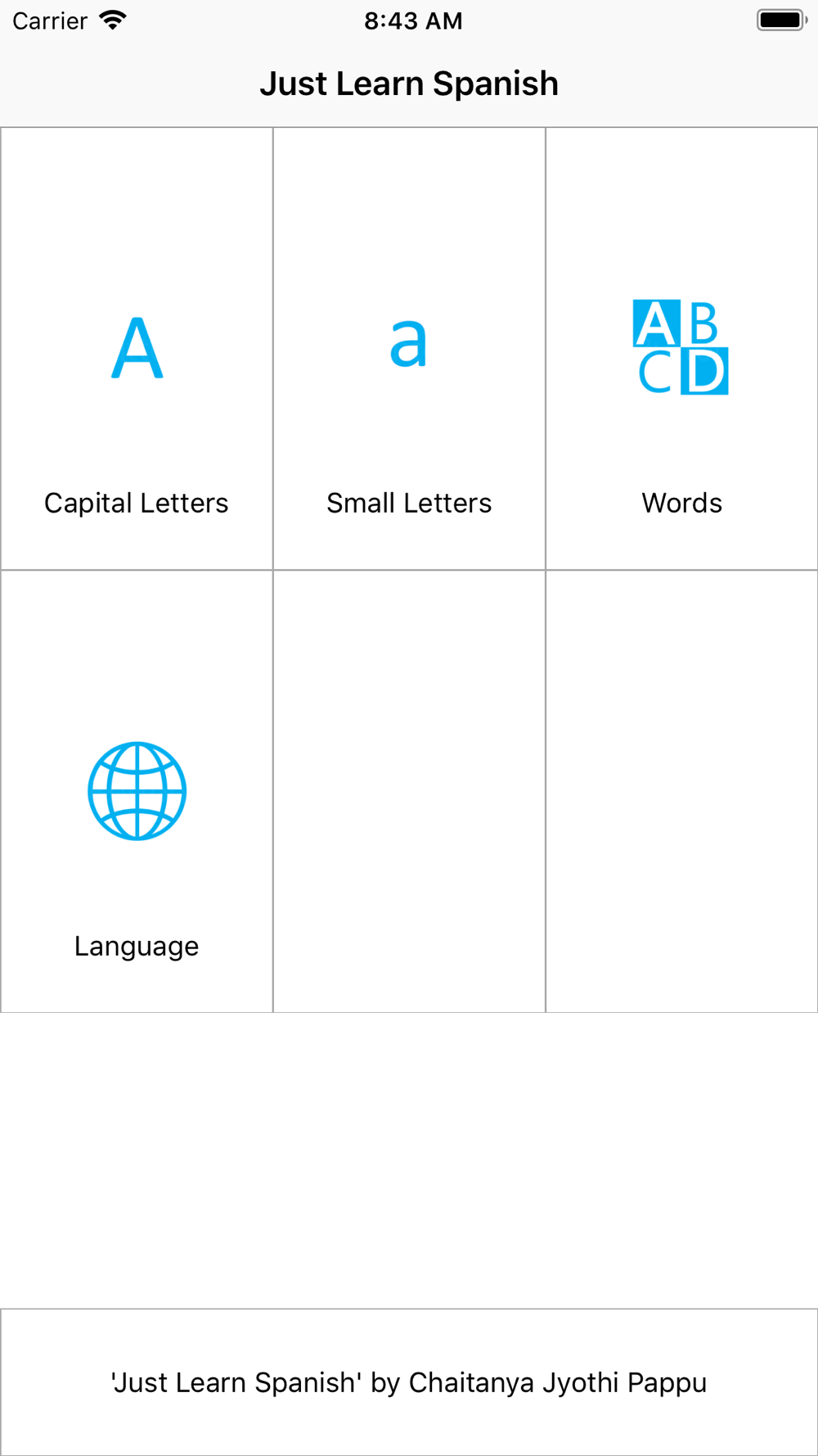 It is a simple application to learn to write and understand the letters in Spanish language and also to learn commonly spoken words.