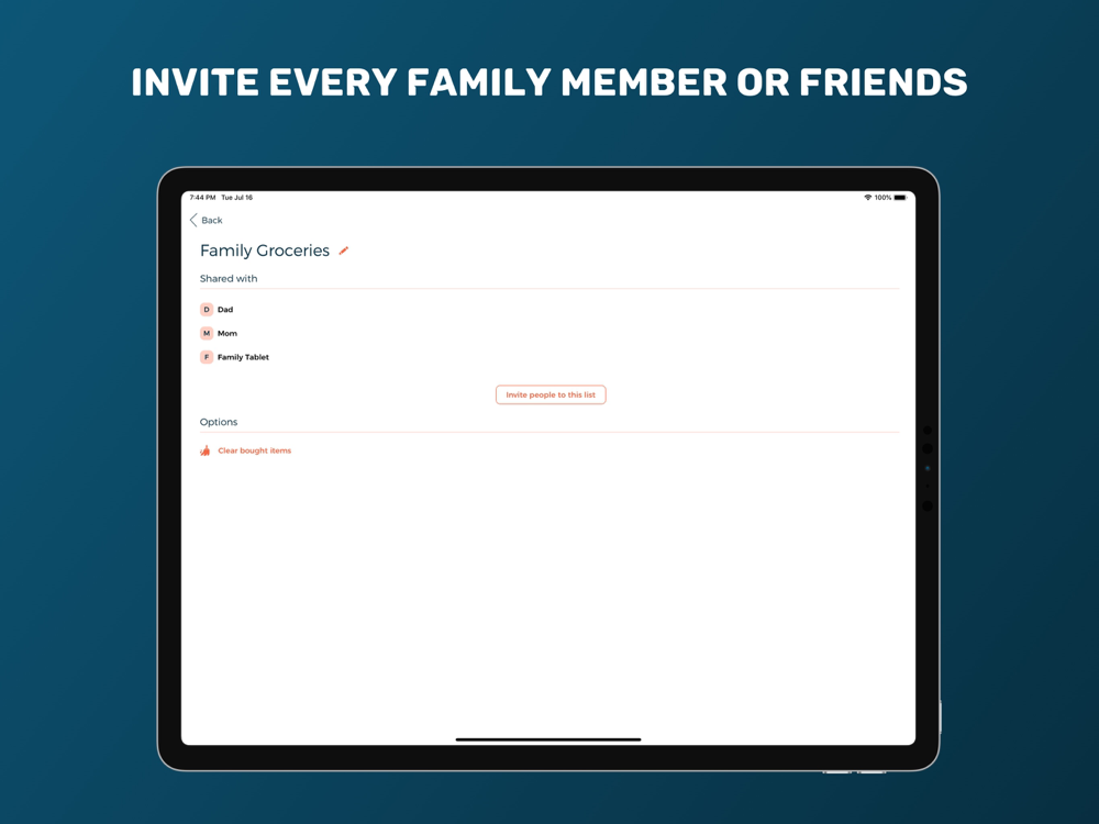 To share a list is extremely easy! Just click "Invite people to this list" and send the link it to your friends and family. Congratulations! From here you are the owner of this list. That means you can remove people from the list, clear the list from time to time or even delete it.