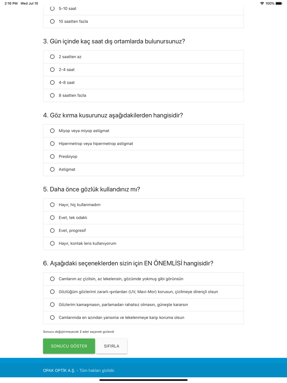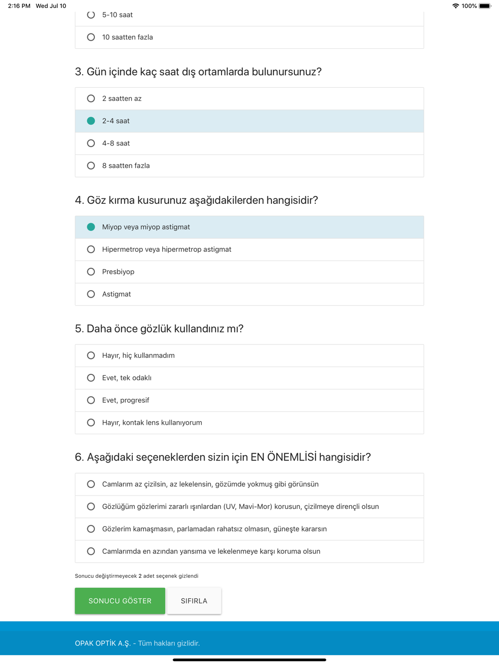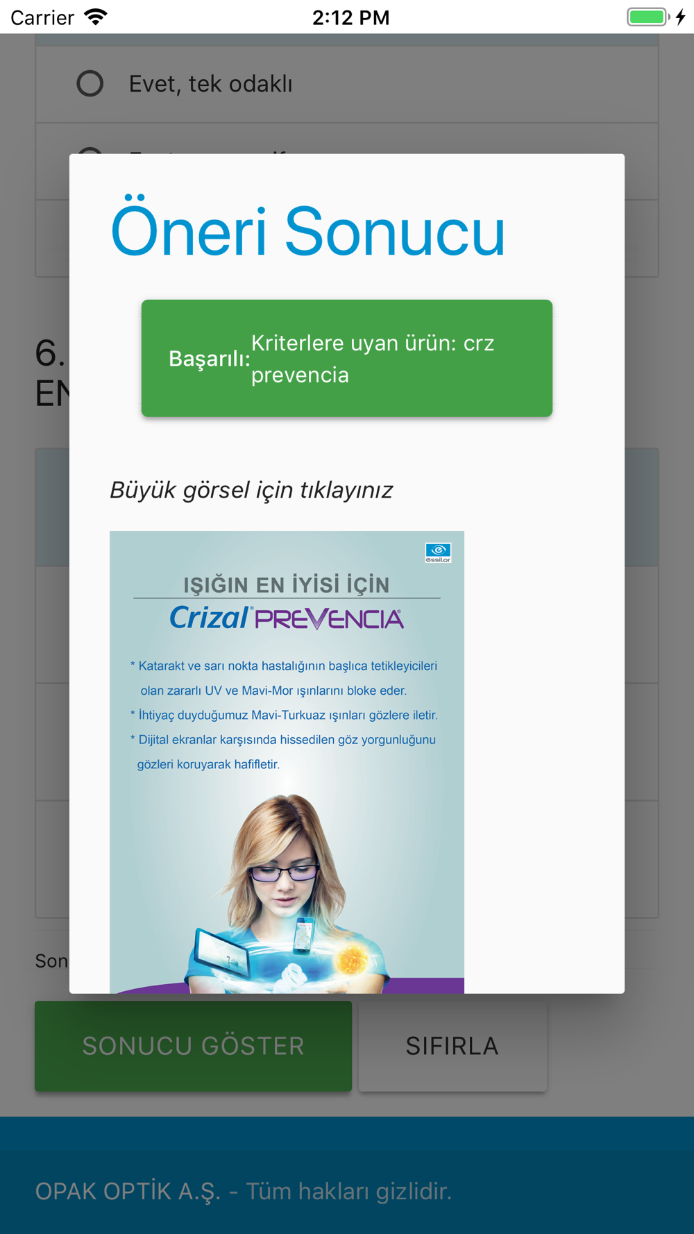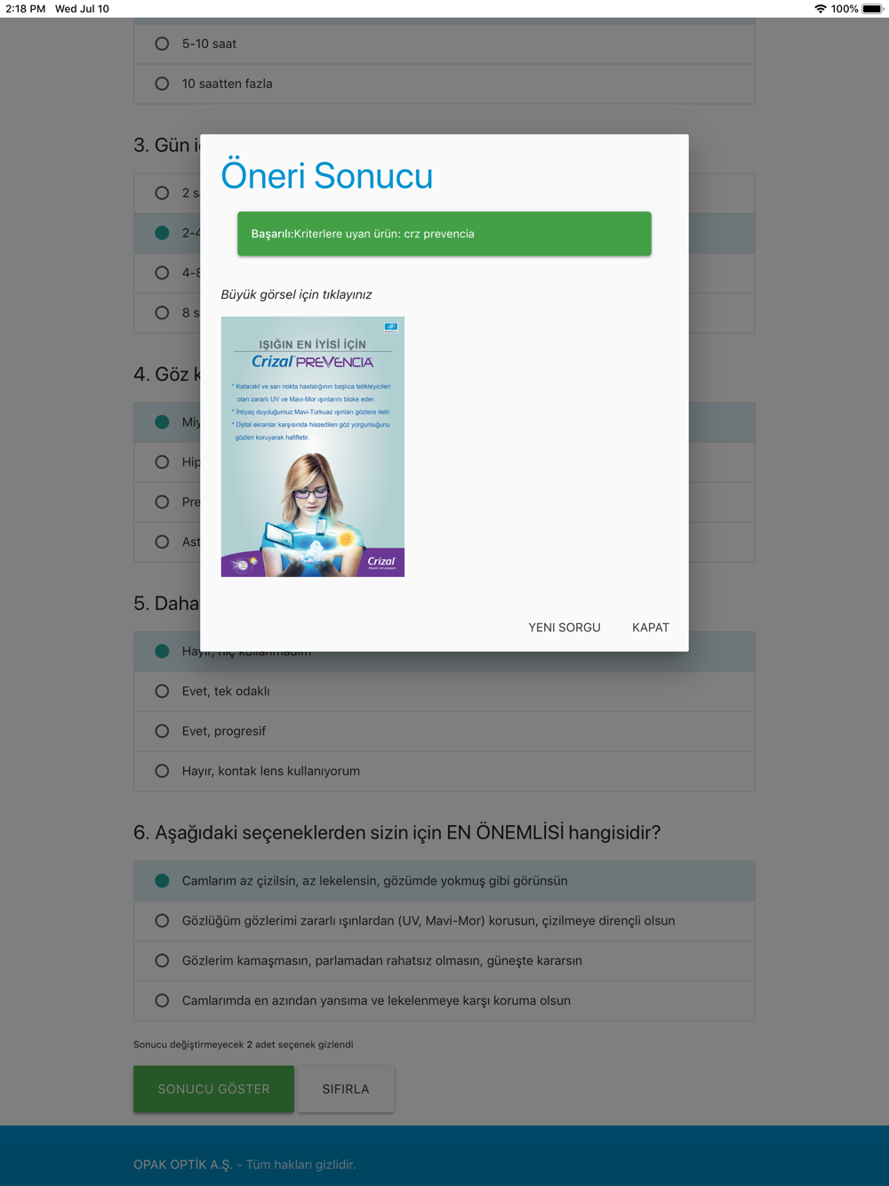 Sorıulara verlen cevapların yazılım düzeneğinde harmanlanması sonucu önerilen çözüm, görsel olarak da müşteriye sunulmakta, pratik ürün özellikleriyle sunumu yapan optisyen/gözlükçünün işini kolaylaştırmaktadır.