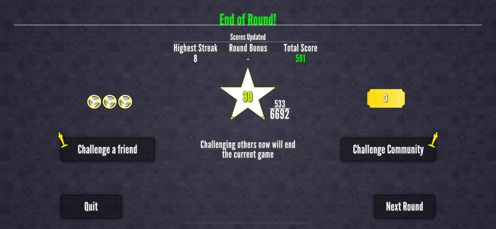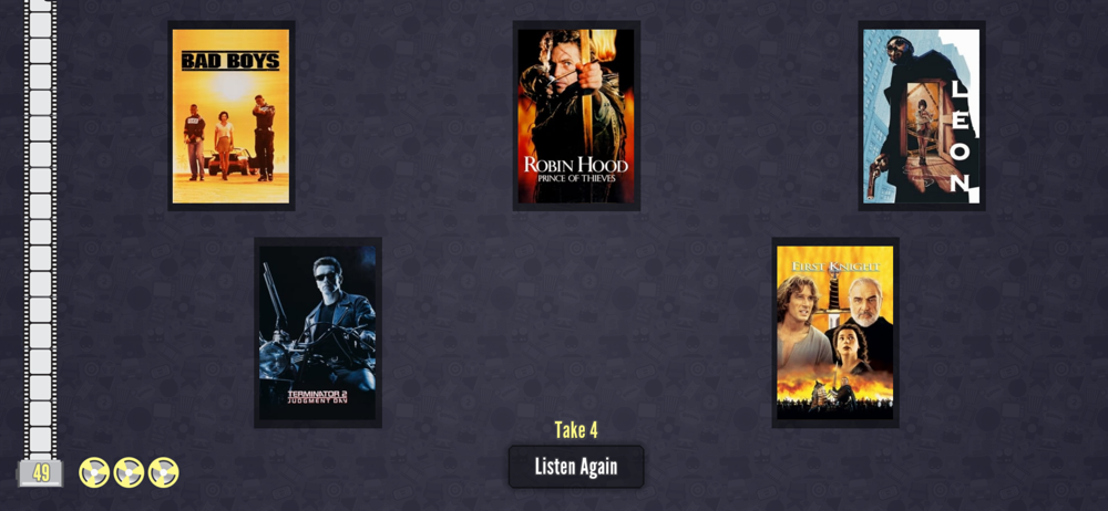 Challenge yourself in solo play, or sign up to level up, earn golden tickets, challenge your friends or the community, access cross-platform leaderboards, or suggest more movies.