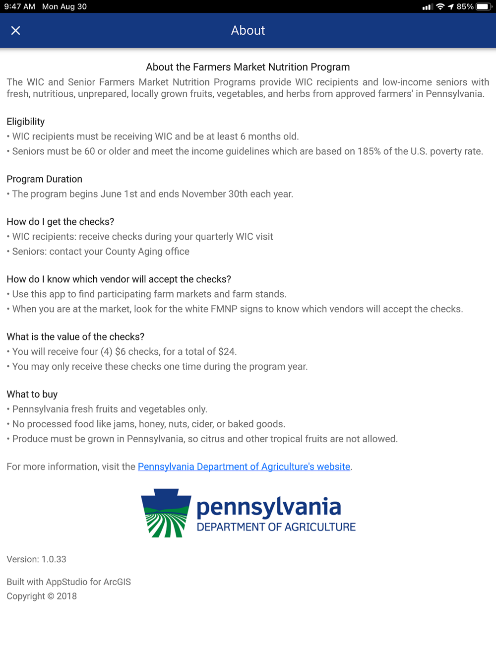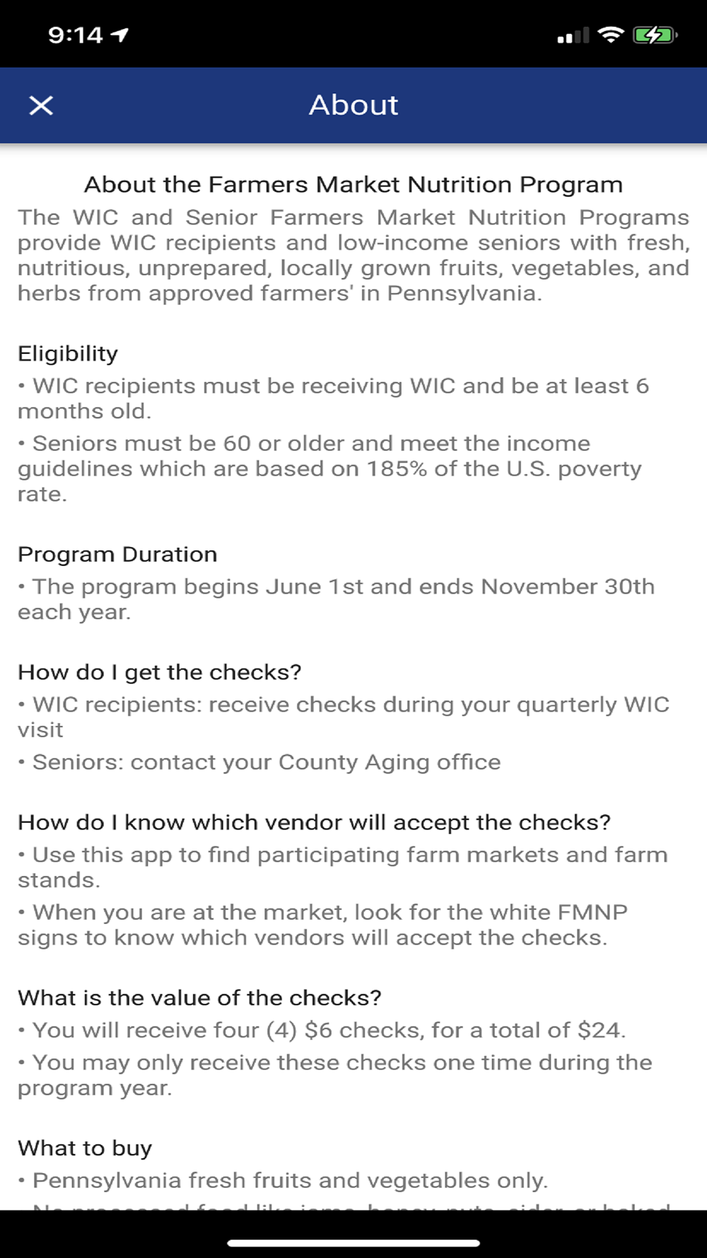 Do you have checks from the PA Farmers Market Nutrition Program to spend but dont know where to go? Download the FMNP Market Locator to find the nearest participating location where you can buy fresh, nutritious, locally grown fruits, vegetables, and herbs for you and your family! How it works: -Easily find a market or farm stand to spend Senior or WIC PA Farmers Market Nutrition Program checks -FMNP season runs from June 1-November 30 each year -Enter a location to find the nearest participating vendor -Quick access to address, phone number, hours, and directions For more information on the PA Farmers Market Nutrition Program, visit the Pennsylvania Department of Agricultures website.