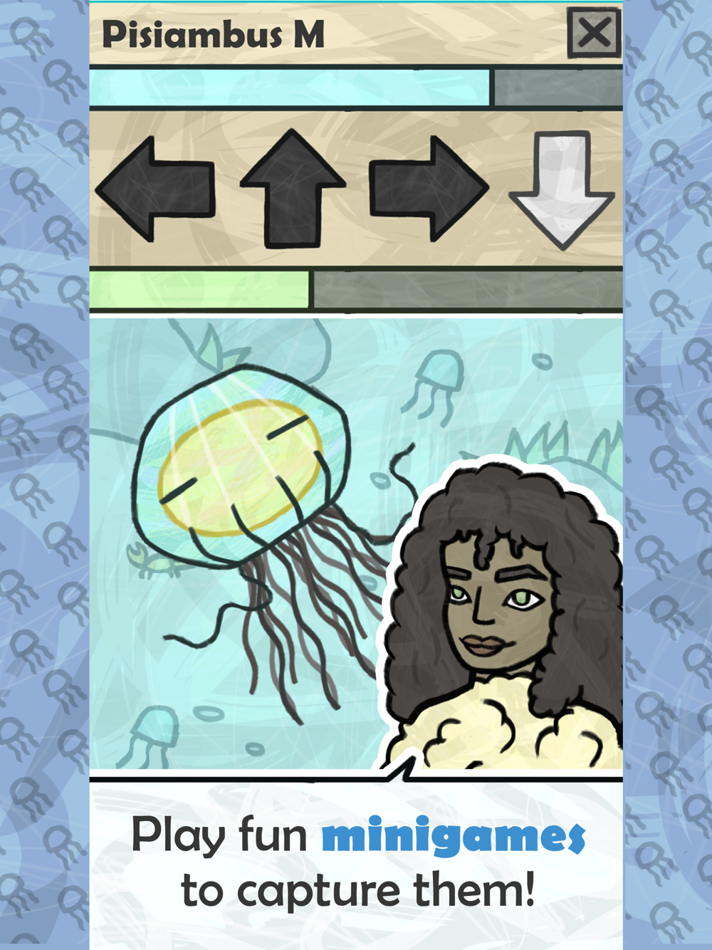 Jellyfishers takes place in a world full of creatures called Jellies that look like Jellyfish. There are too many in Earth so your mission is to capture lots of them to take them back to Jelly-nate, their own planet.