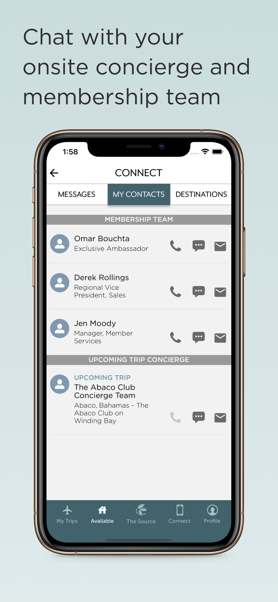 • Send messages directly to your on-site Concierge, Ambassador, or Regional Membership Director