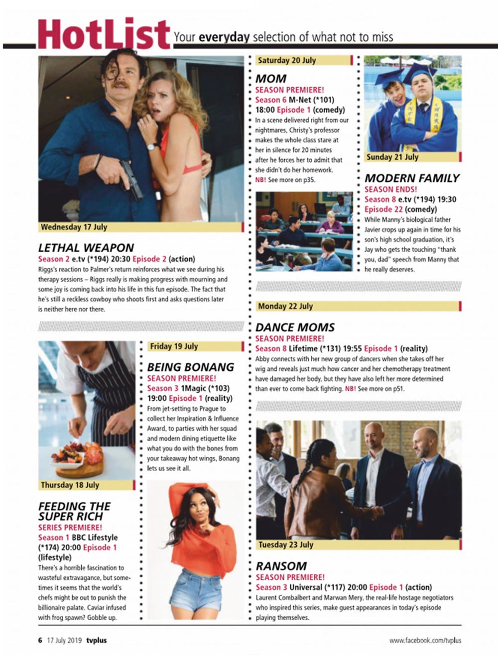TV Plus is aimed at dedicated viewers of the two million South Africans who spend more than 25 hours a week in front of the TV. It is typically South African and has no overseas partners or ties. It is not just another TV schedule, but provides valuable information on programmes. TV Plus caters for readers obsession, like a close friend with whom you comfortable watch your favourite soapie, share a cup of tea and chat about what can still happen. There are wonderful stories, gossip and glamour from here to Hollywood, plus everything the couch sports lover may want. There are exciting pictures, recipes, fashion, beauty, irresistible competitions and essential information for kids about their own programmes entertaining and educational.