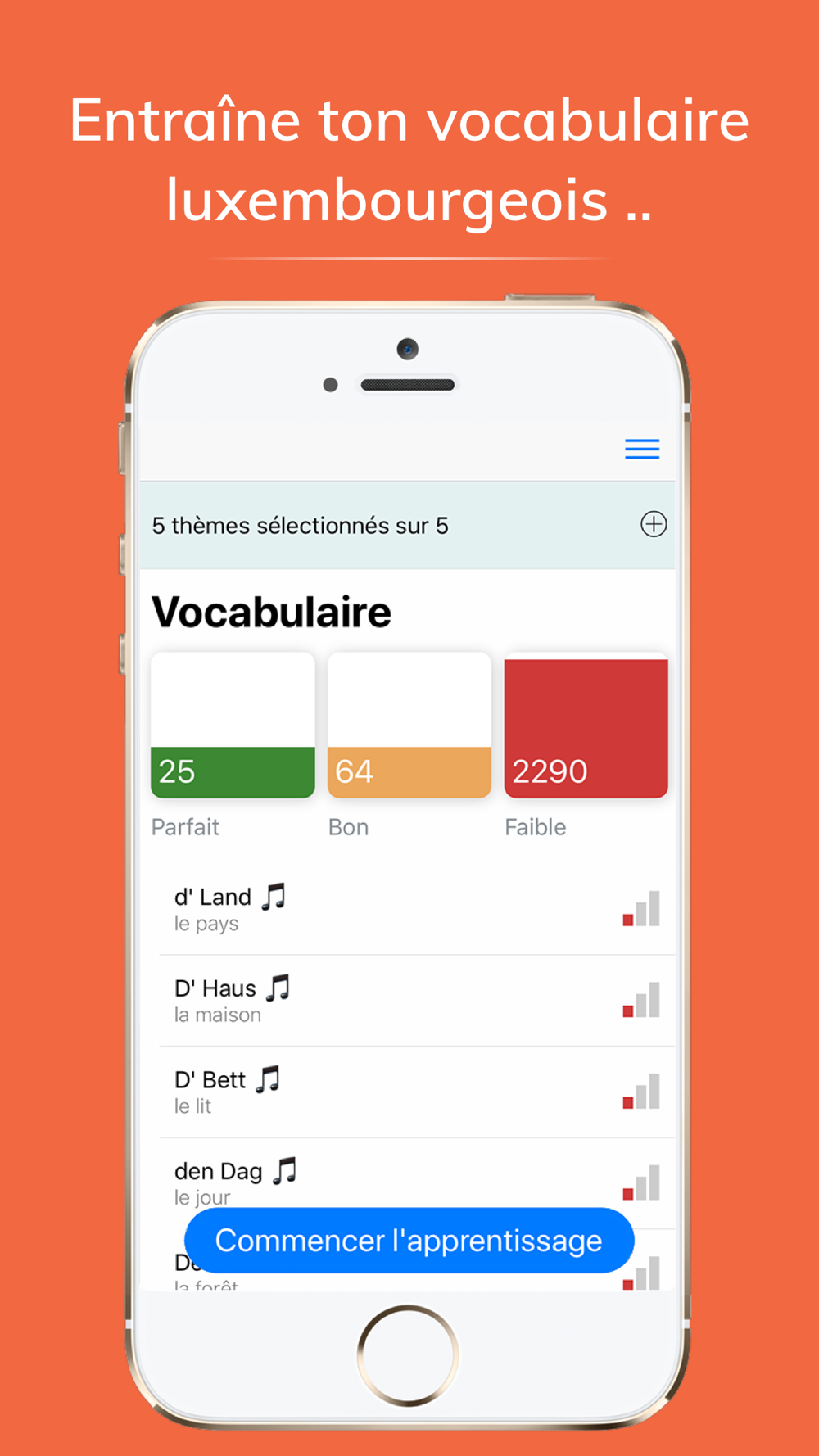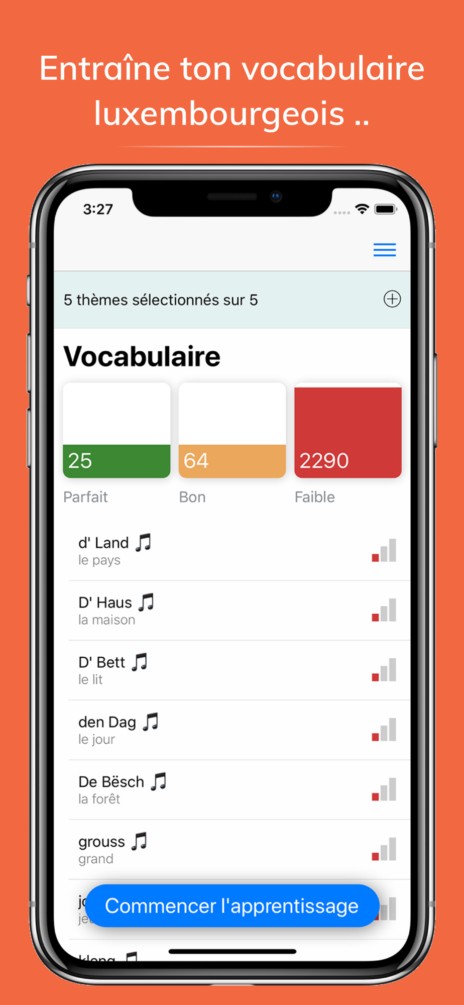 Avec plus de 3000 mots et audios, cette nouvelle application vous aide à vous entraîner sur le vocabulaire luxembourgeois. Wuertschatz vous aide à repérer vos difficultés et à les surmonter grâce à son algorithme intelligent. Choisissez une ou plusieurs thématiques, et testez vous !