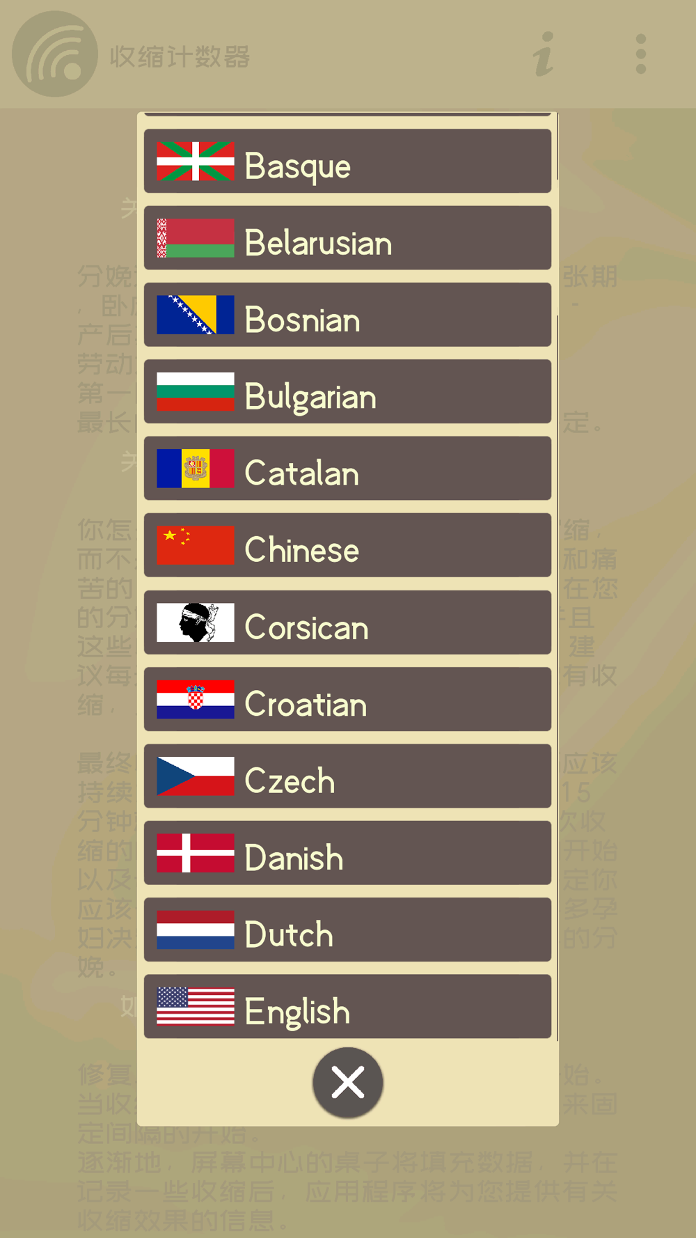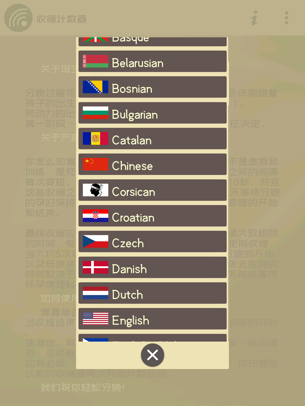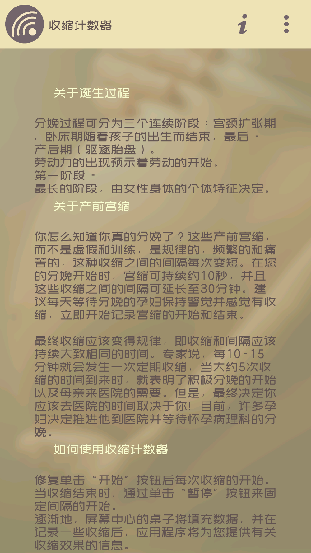 该应用程序将允许跟踪收缩的开始,收缩的结束,收缩之间的间隔,删除收缩,并再次开始计算会话。在跟踪一些收缩后,我们的应用程序将为您提供有关收缩活动有效性的视觉信息,告诉您如何正确考虑收缩。这个应用程序将告诉未来的母亲何时应该去医院。