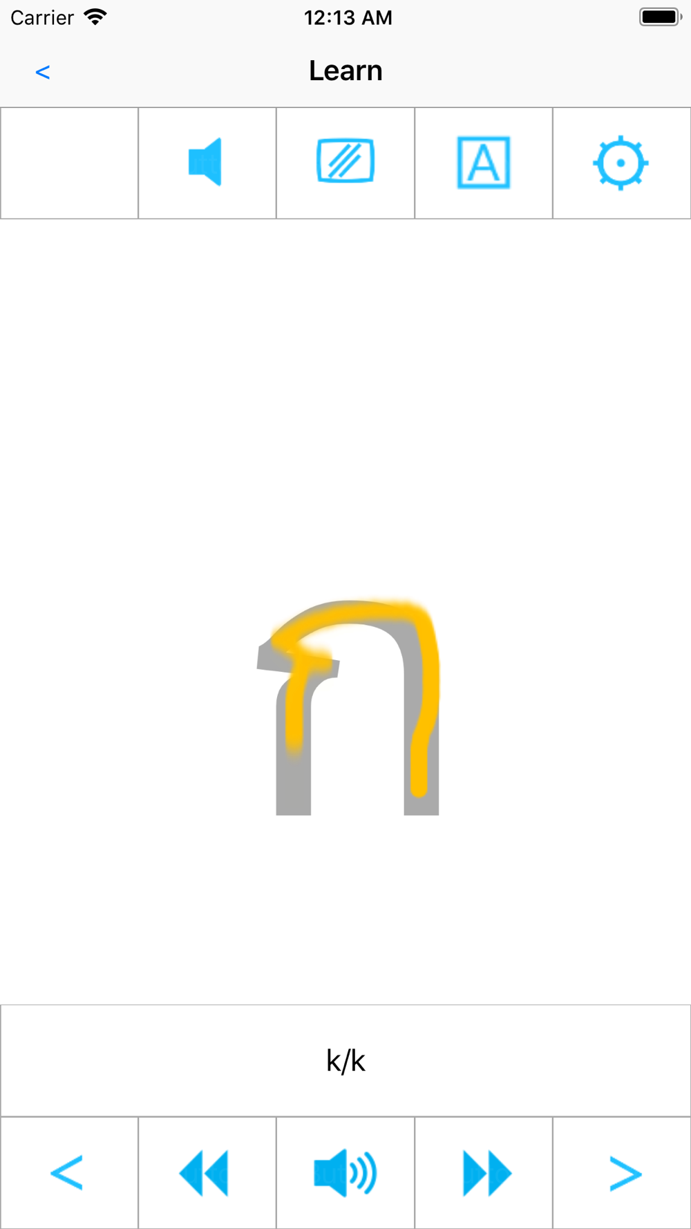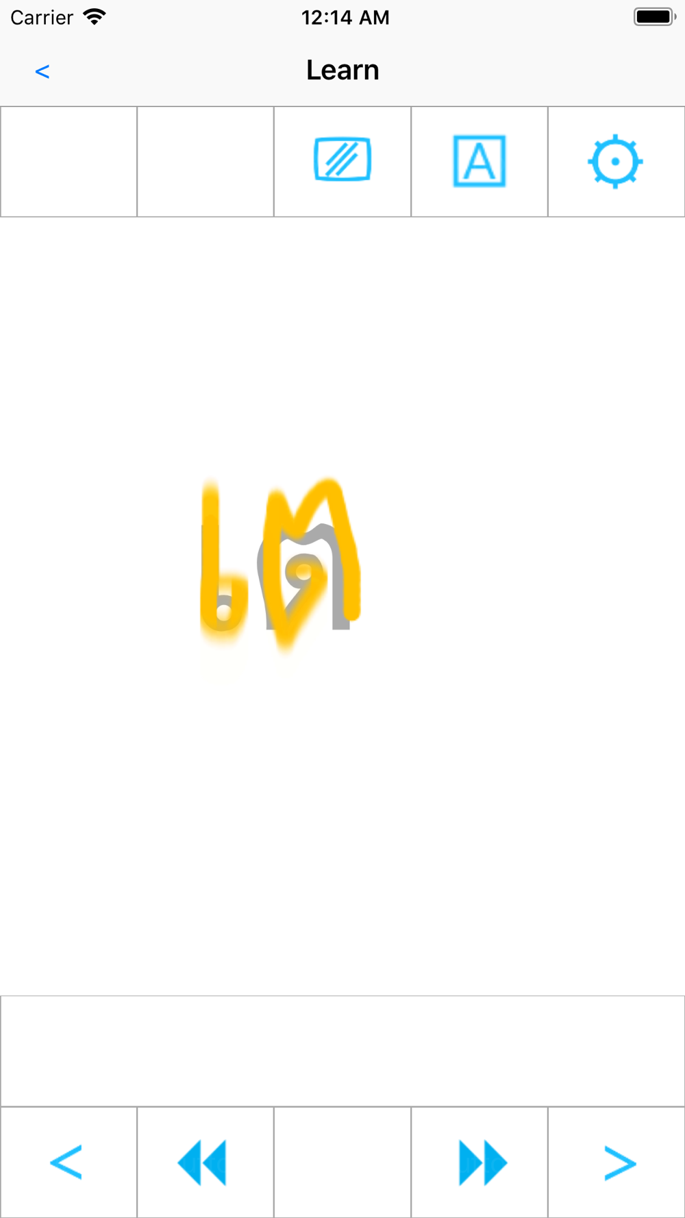 Letters and diactrics are included as part of alphabets. A list of letters are provided for easy comprehension. For practicing the writing of letters a drawing pad is provided with a hint of letter as background. Letter pronunciation is provided in audio. Options for selecting width and color of stroke along with eraser is provided. Letters can be navigated easily using navigation buttons. All these options are provided separately for vowels, consonant and compounds. A test option is provided to check the learning.