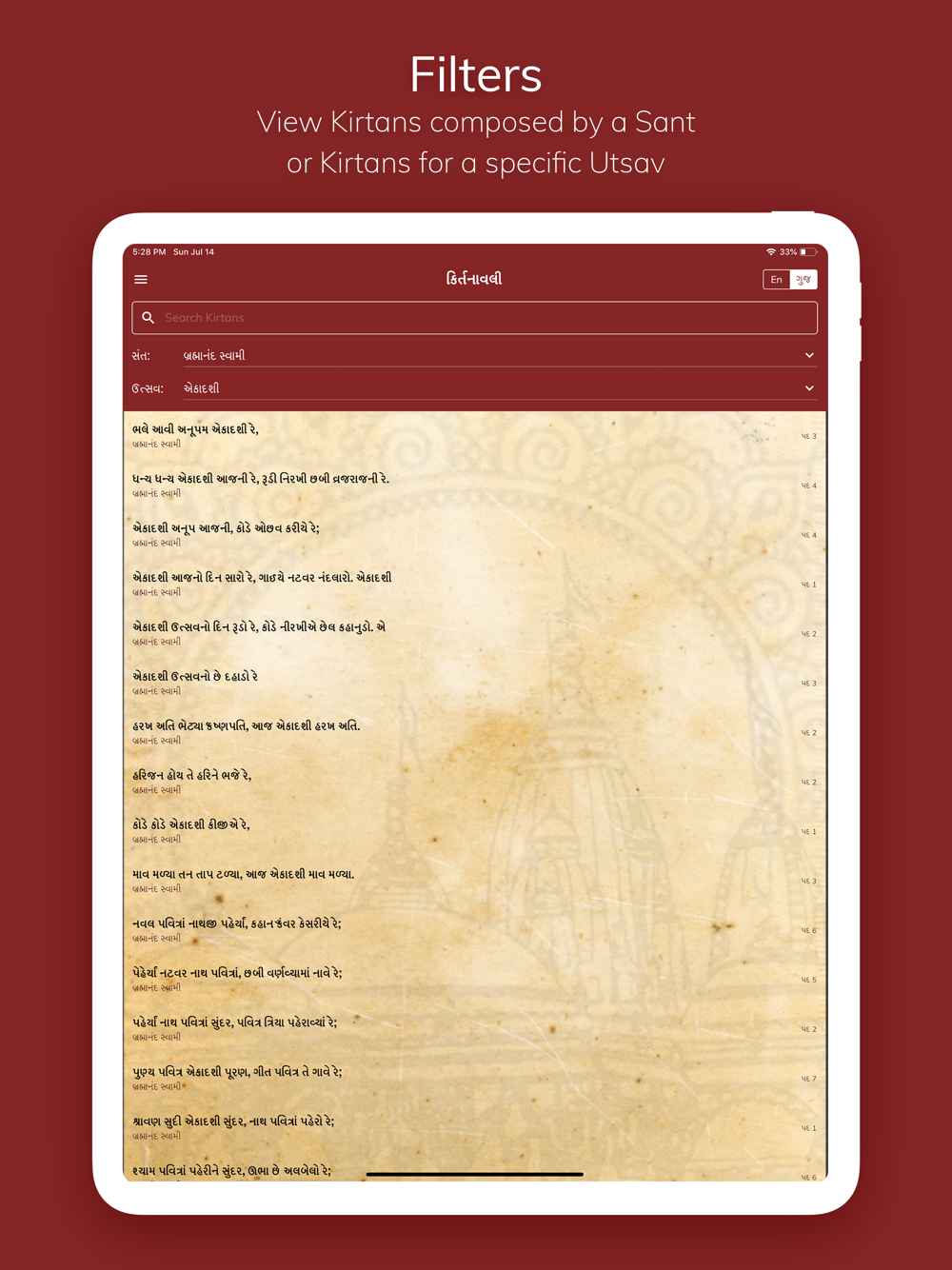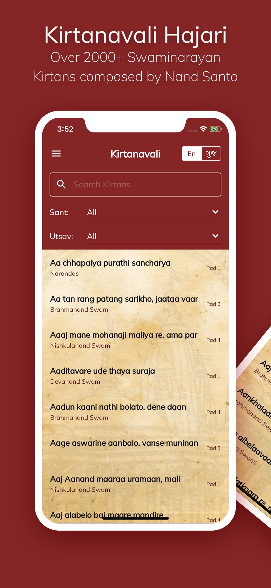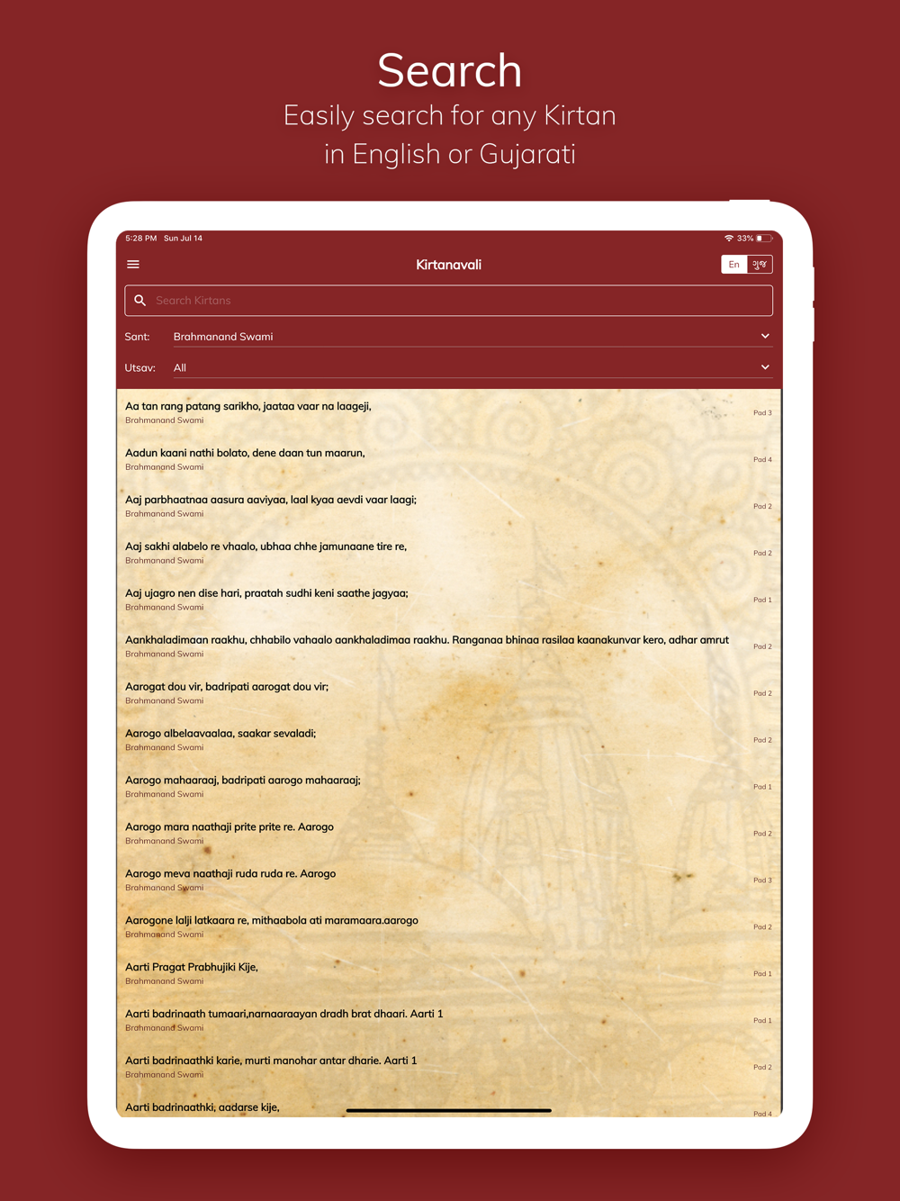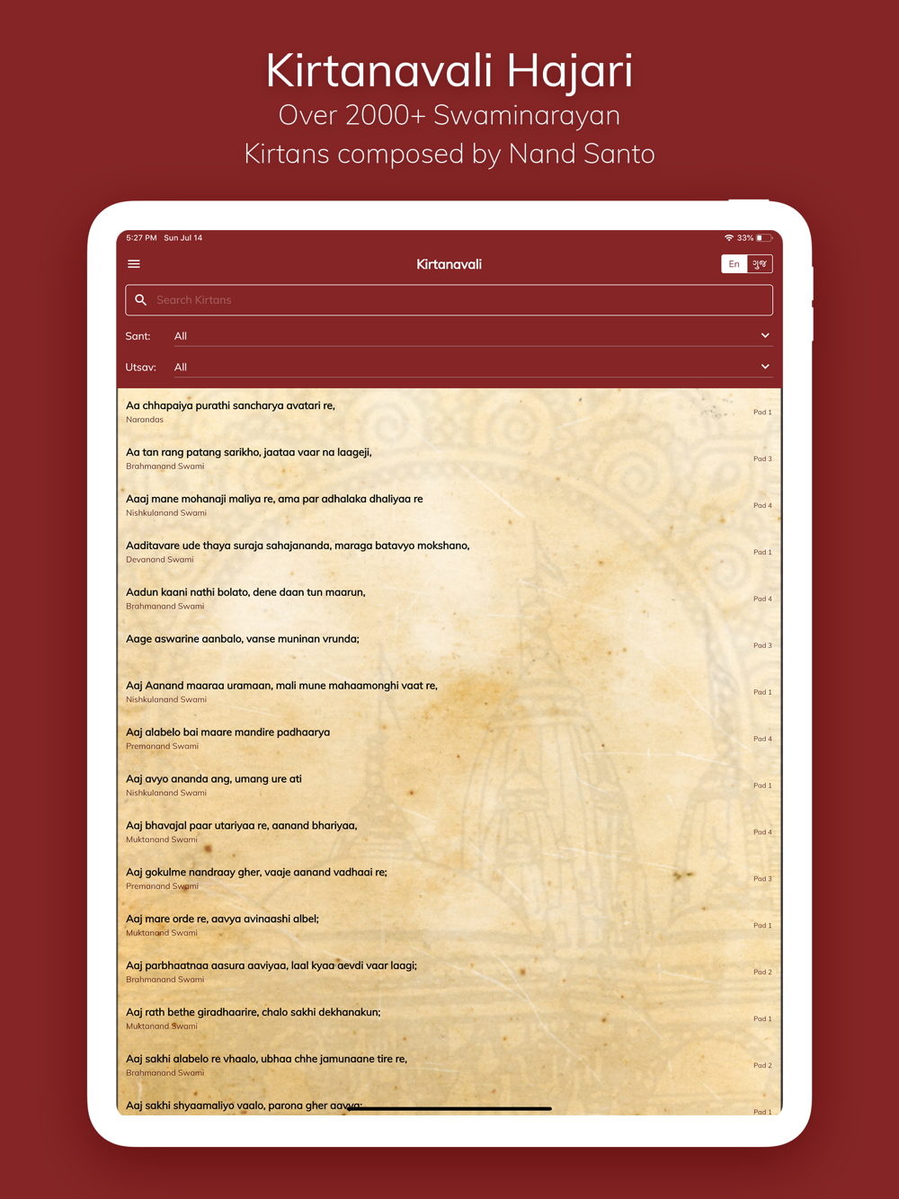 The words in these Kirtans are so powerful that they can awaken one's latent soul and enlighten our heart with Faith and Bhakti. Kirtanam Bhakti is considered to be one of the easiest forms of Bhakti in this age of Kaliyug. In a humble attempt to make this even easier, Shree Swaminarayan Mandir Kalupur Media Team have put in a tremendous amount of effort to gather and compile a database of over 3000+ Kirtans available in Gujarati and in English (Lipi).