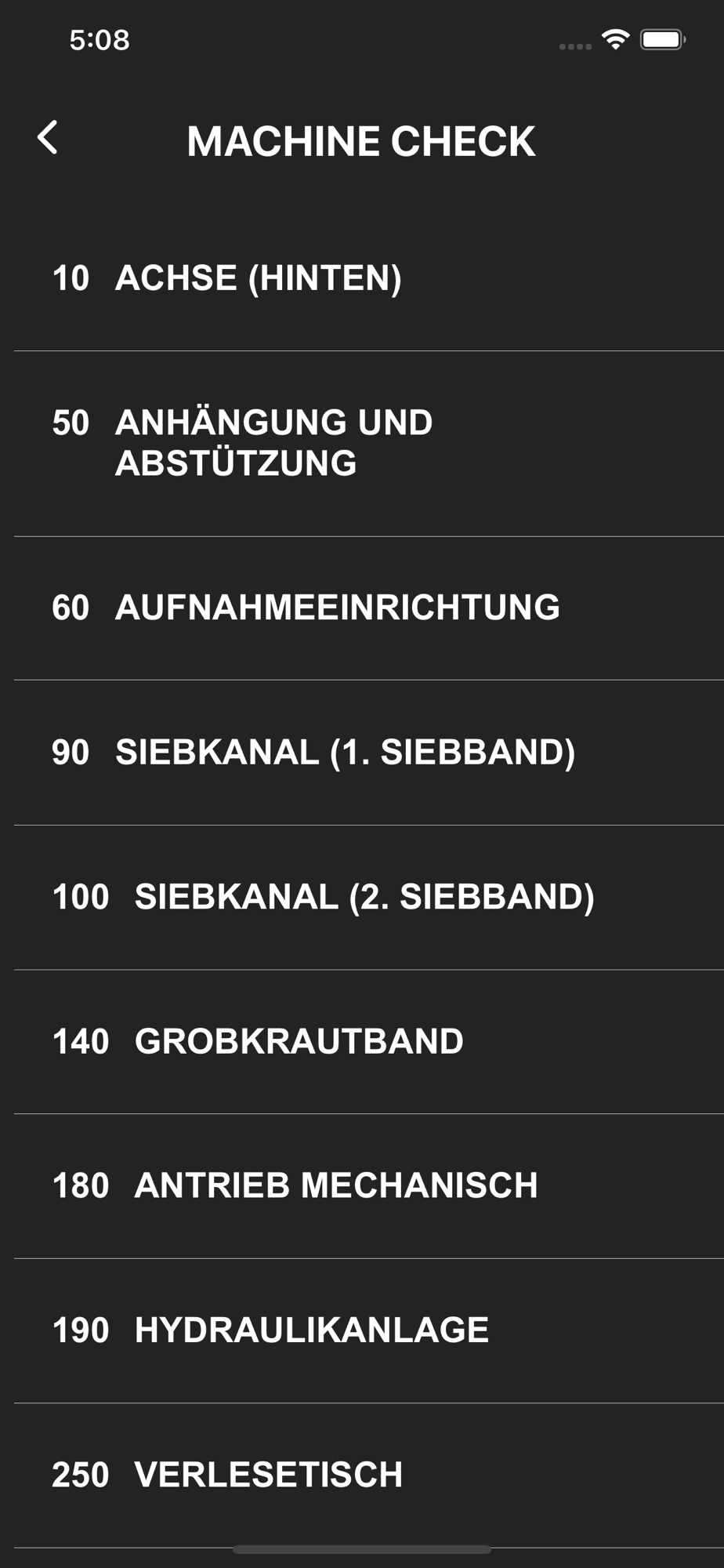 With Werkstatt-App we have created an easy tool to audit GRIMME machines. The yearly check-up can be performed step by step, guiding the user through questions while checking each part and reporting damaged parts. Spare parts lists are shown and can be picked directly for the report. Each check-up is saved in the app so that the user has a direct overview of all previous check-ups.