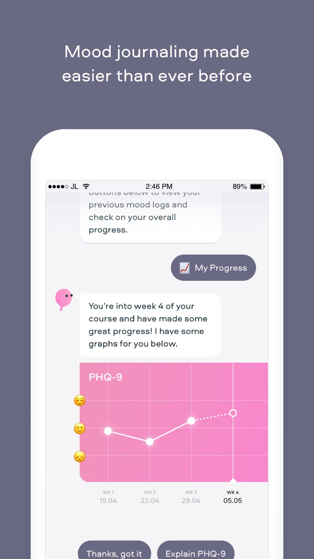INTERACTIVE AND ENGAGING. In a study of 300 patients in in CBT treatment for depression and anxiety in the UK, Limbic saw a 3x increase in engagement relative to the average reported for other mental health apps. User interactions with the chatbot produced a total of 15,808 mood logs (an average of 15/patient/week). So give it a try - talk to Limbic!