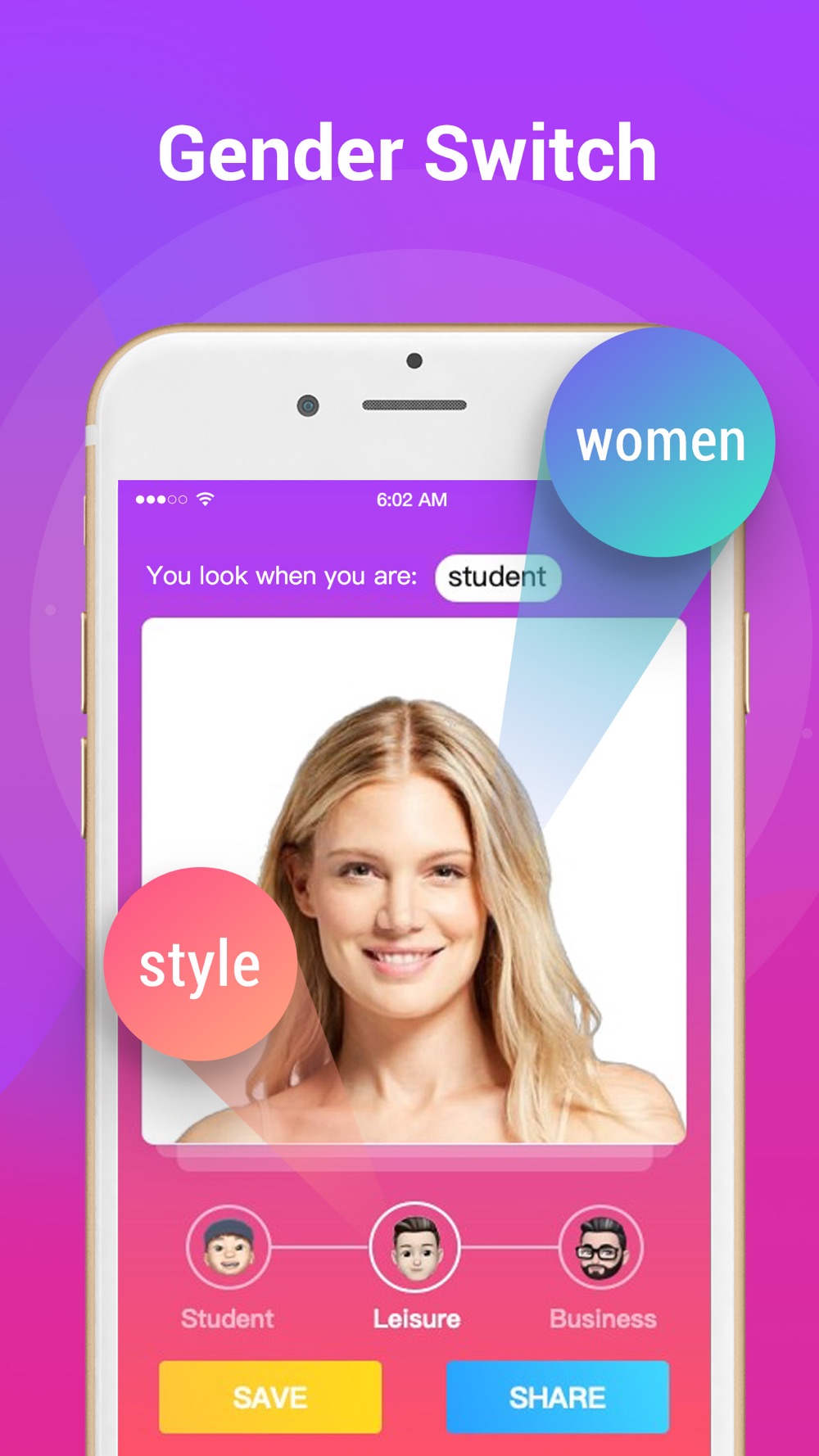 Have you ever imagined your future look? Upload or take a current photo, and you will see yourself in 10 years, 20 years, 30 years, or even 50 years. Sit on the Time Travel Shutter of Face Aging App, and meet yourself at different age .