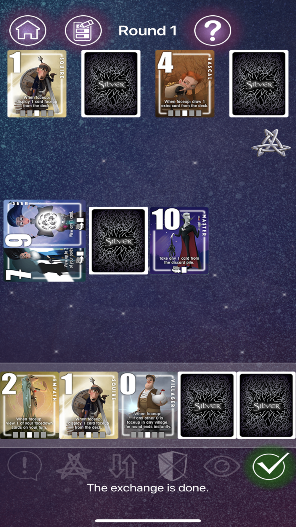 Your goal in Silver is simple: have the lowest sum by the end of four rounds. To accomplish this, use abilities from the cards you draw, and from cards that are already face up in your village, which consists of five cards. You can trade in matching cards, and also trade out your cards for ones you draw to make matches or to lower your score. End a round early if you think you have the lowest sum by calling for a vote; if you’re right, you score 0 points, and get to use the Silver Amulet of Protection the next round. If you're wrong, though you get the sum of your cards plus ten points!