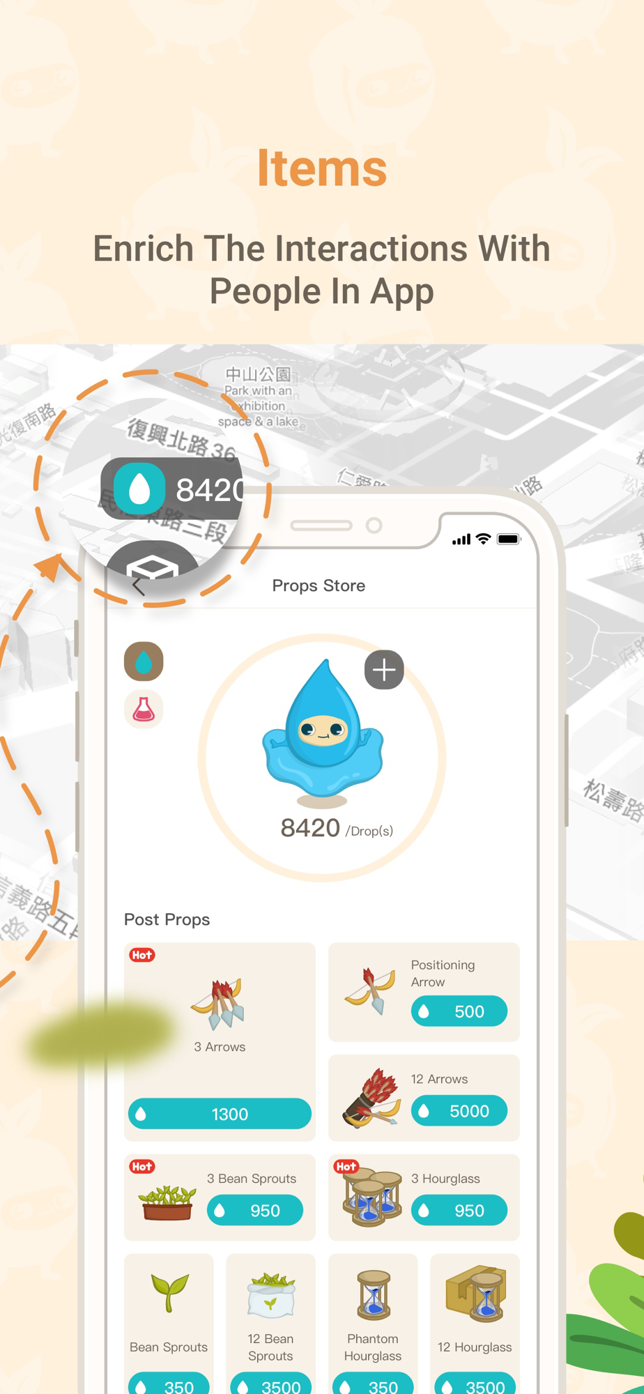Game system: Earns water drops with sunlight (like from others), purchases props with water drops and uses props on the map.