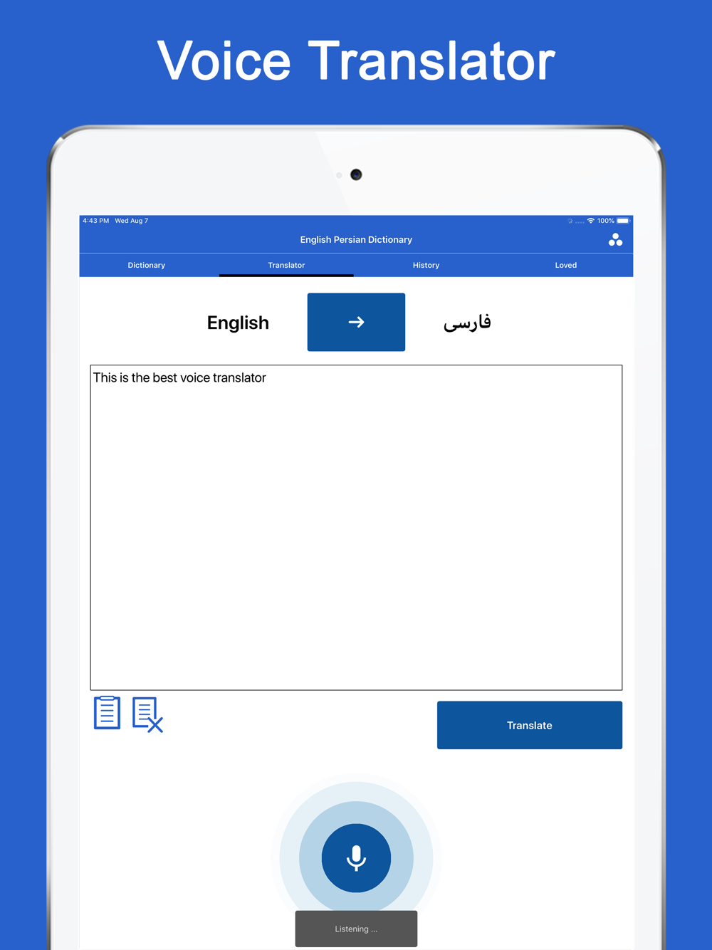 Persian English Dictionary offline and free. You can search both English and Persian words. This is not only a Dictionary but also a learning tool. You can use this dictionary when you have no Internet connection.. There is autosuggestion so you need not type full words. You also can use Speech to text feature. When you start typing, you will see some words starting with the letters you typed. The dictionary searches in a database for the matching words. This will be helpful to find out the meaning of any word.