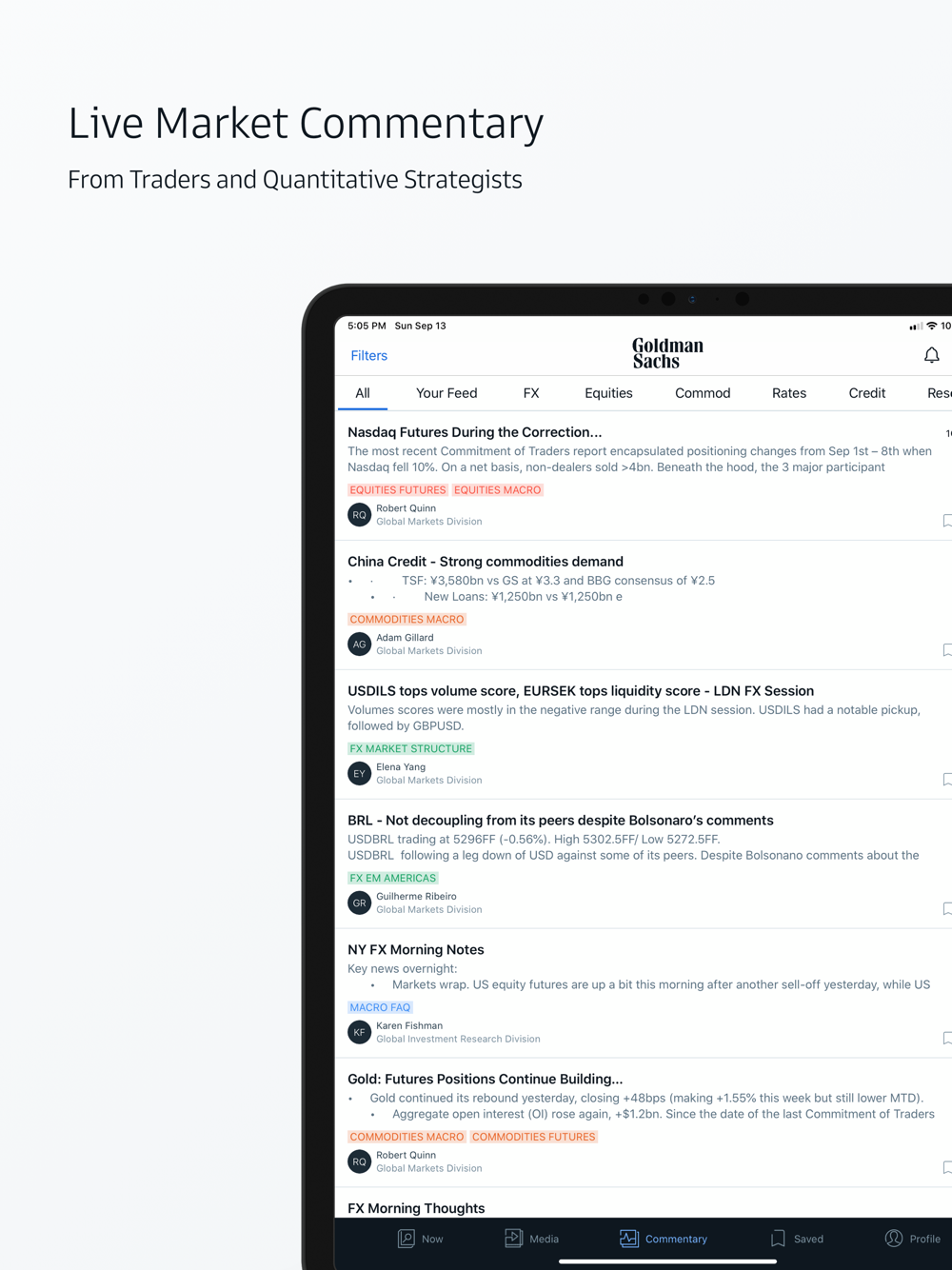 o Live commentary on what’s happening in the markets right now from Global Markets sales, traders and quantitative strategists