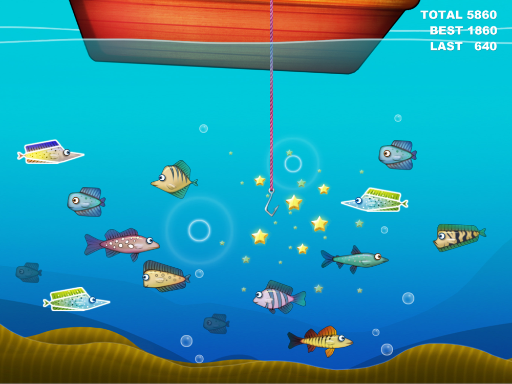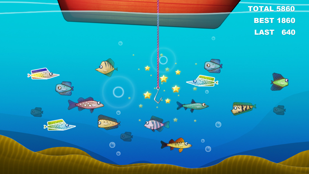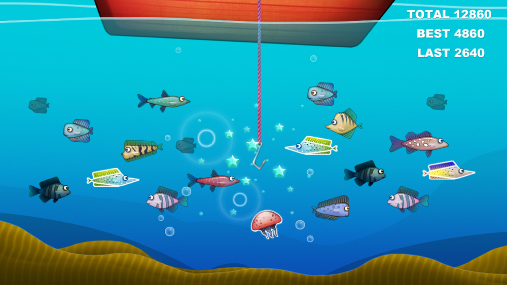 Just touching the fish with hook user will get the score. But be aware of enemy fishes and other enemies.