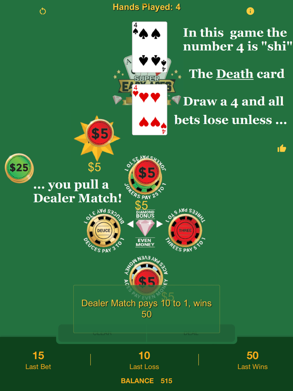 Super Easy Aces was created by a casino dealer with over 40 years in the business. S.E.A. was developed for live casino play and is certified by Gaming Laboratories International for multiple gaming jurisdictions including the state of Nevada.
