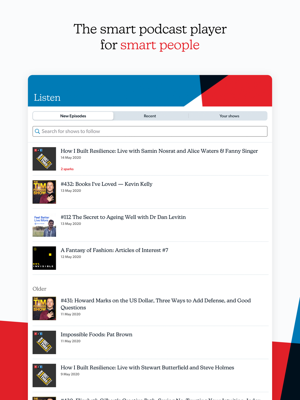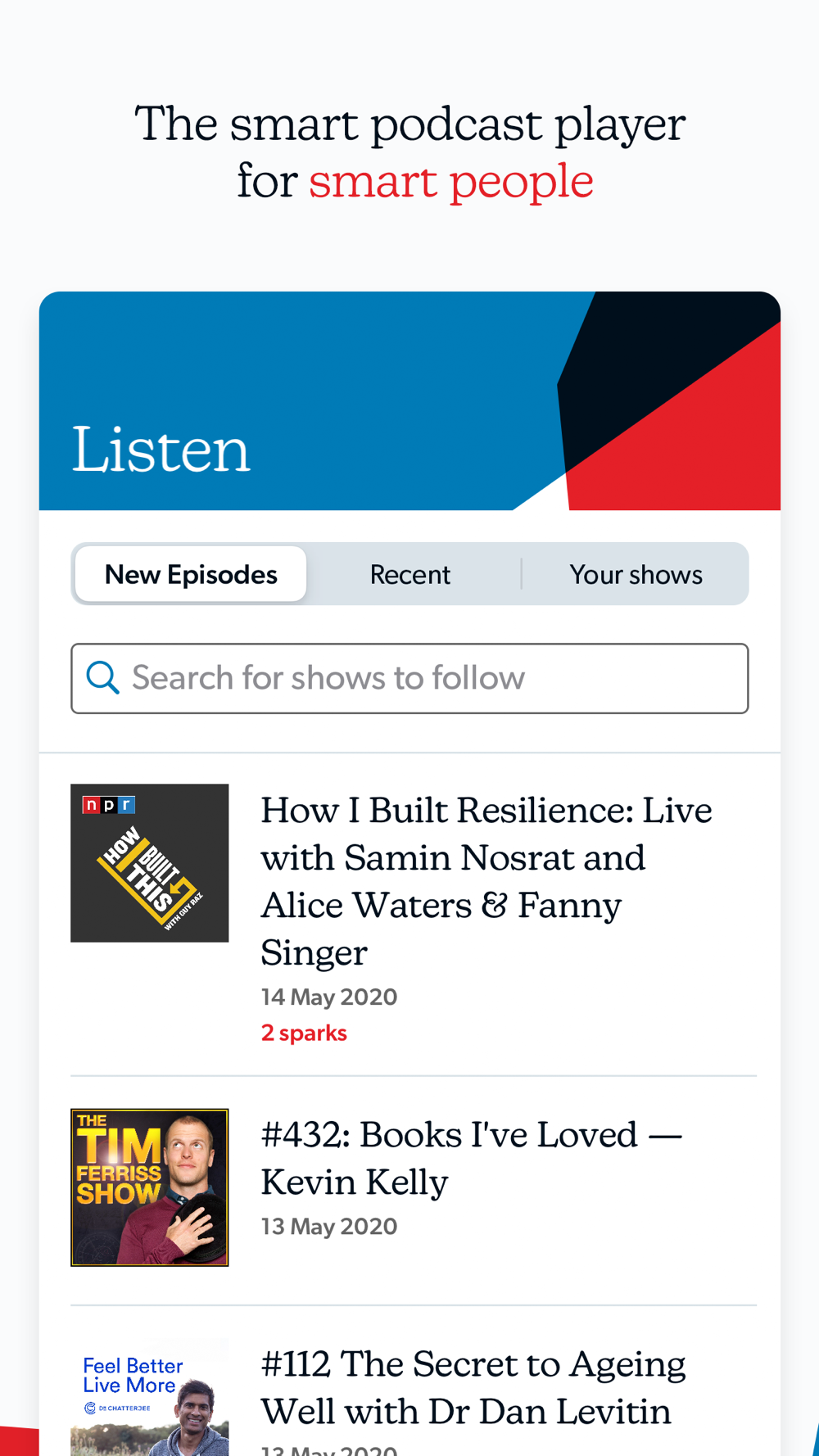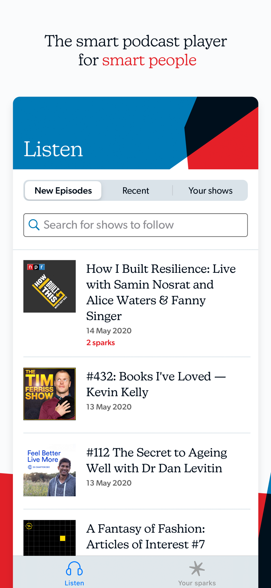With Sparks you can follow all your favourite podcasts and listen to new and past episodes. Whether in the car, the kitchen or on your daily commute, Sparks is ready to supercharge your podcast listening.
