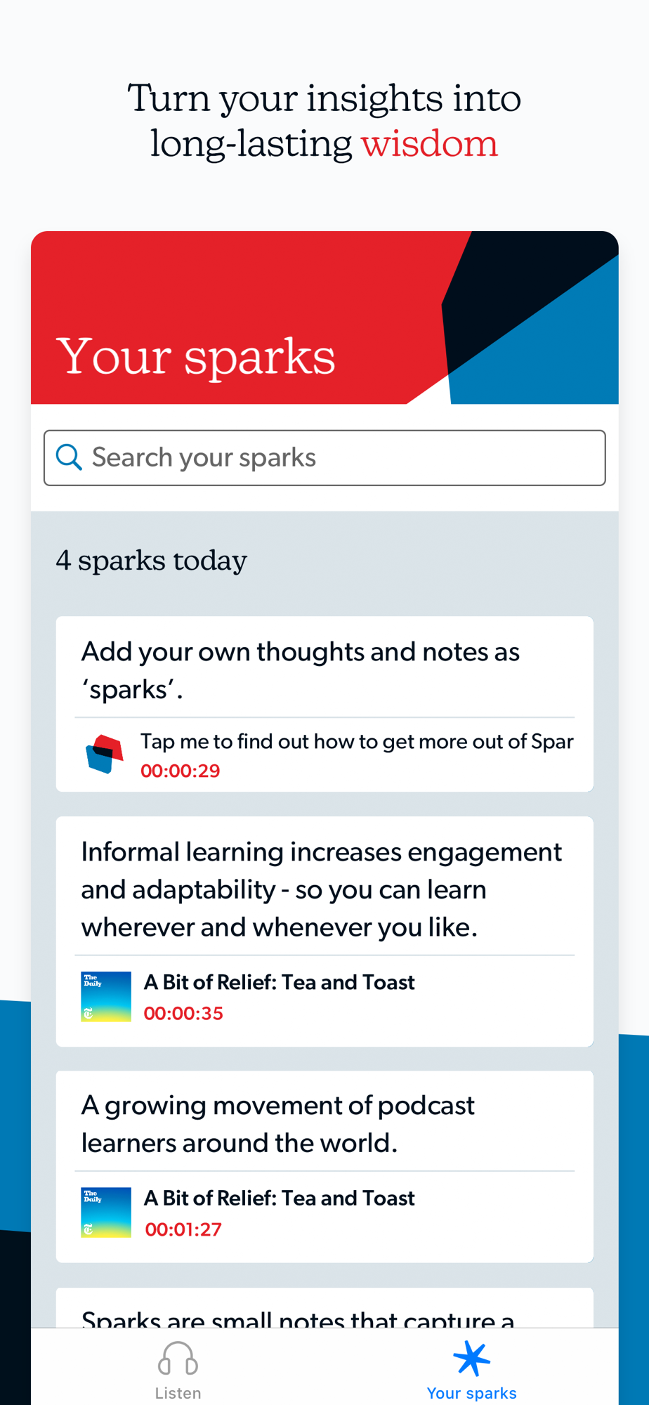 The Sparks podcast app helps you maximise your learning from your listening; take notes and capture all those fleeting insights from your favourite podcasts.