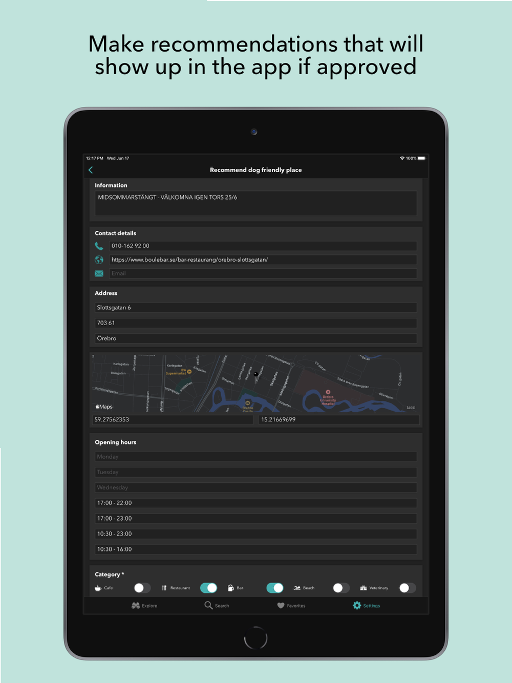 Get access to hundreds of dog-friendly places! With the help of search filters and sort options, it will be easy for you to find what suits you. You will get easy access to contact information, opening hours and geographical location. You can easily navigate to dog-friendly places and find out which dog-friendly place is closest to you. Recommend dog-friendly places that will be added to the app after review