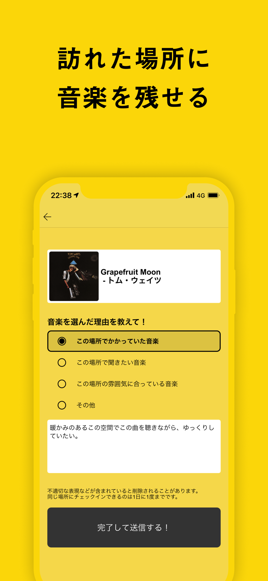 ・ そこに合うと感じた音楽や、その時に聞いていた音楽を、場所に記録することができます。