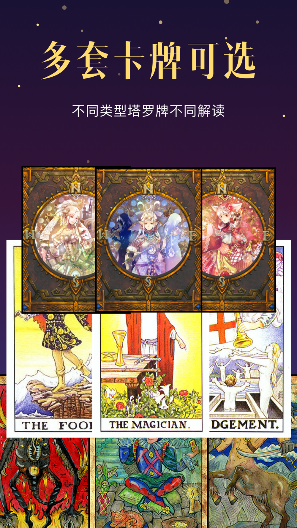 【占卜玩法】由22张大阿尔卡纳牌和56张小阿尔卡纳牌组成,让您清楚的知晓您的爱情,学习,事业,财运,未来方向,让你更加了解您的过去,现在,未来。