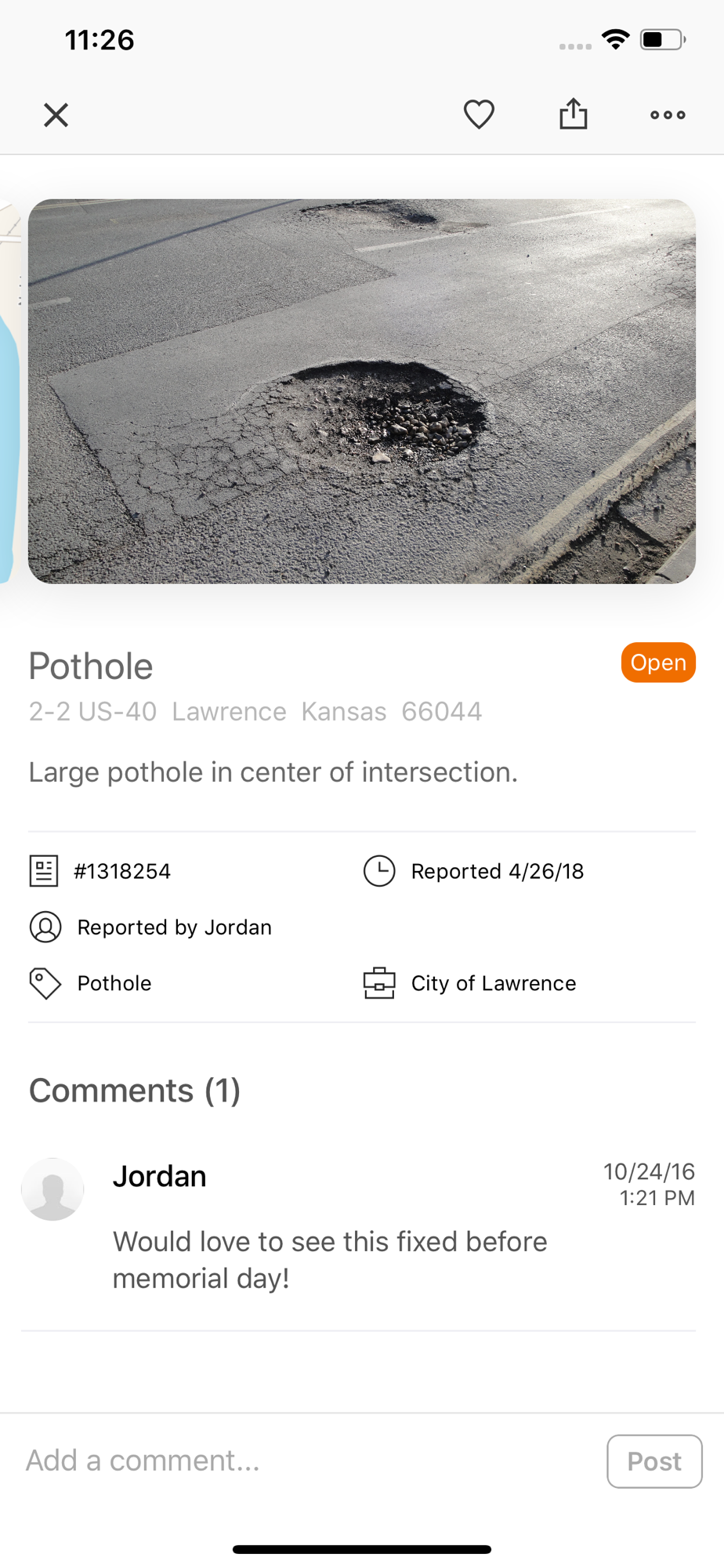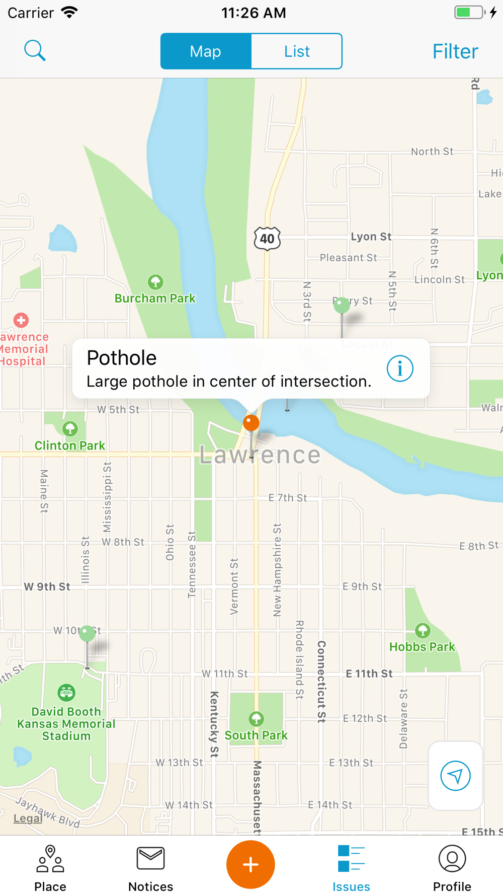 With the power of the Lawrence Listens app in the palm of your hand, you can submit requests for assistance with city services more easily than ever. Potholes, damaged street signs, street maintenance, streetlights, damaged trees, parking meters these and many others can be reported from your smartphone. Use your smartphone's GPS to find your location and send a picture to help city employees identify the issue. All submittals will be routed to the appropriate city department to be addressed in a timely manner and provide updates back to you. The Lawrence Listens app is 'hear' for you! Download and start using the Lawrence Listens app today and help make Lawrence a better place to live, work and play!