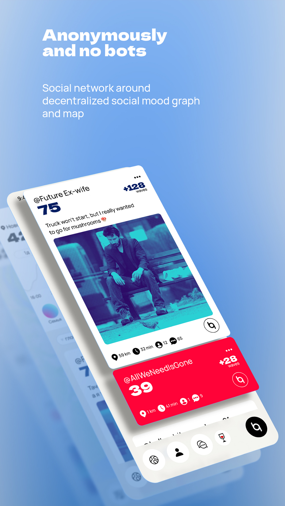 In this case we suggest our geolocation chat as a tool to get in touch with those who matters the most - people surrounding you. Imagine air filled with thoughts, attributed with a mood? - Here we go! - absolutely anonymous. Share your mood with the world! - Get a feedback or support someone in time of need! - share your thoughts and get to know the most relevant information around or on the other side of the planet. It is so much fun! - Take time and discover!