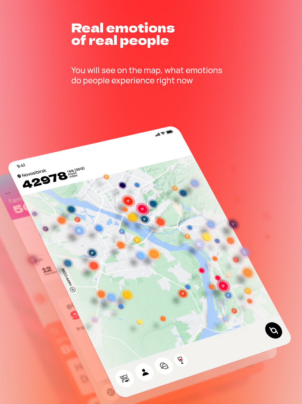 Real-time dynamic heat maps of mood emissions, waiting for you, filled with users' messages and emotions.