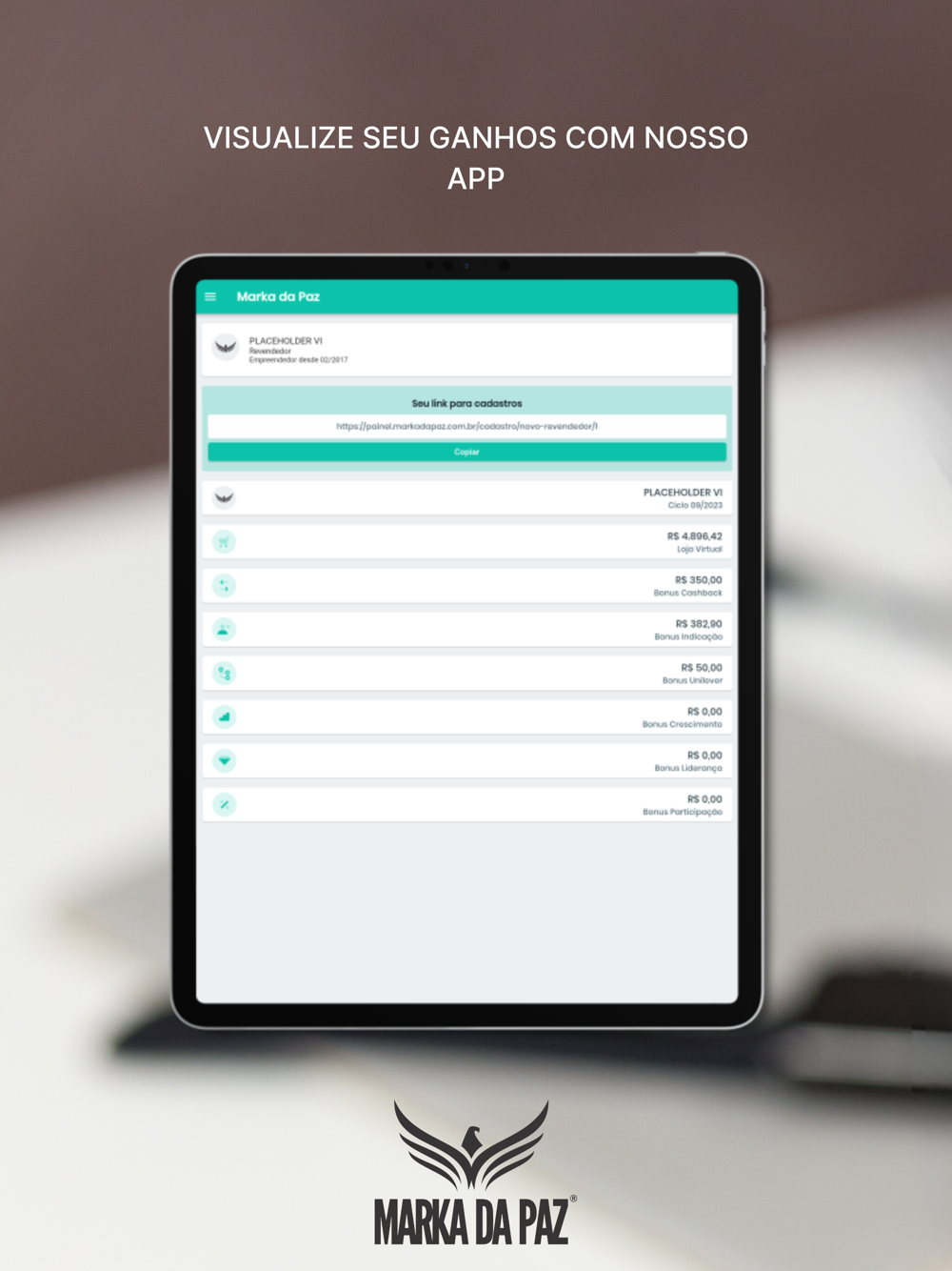 Aplicativo para revendedores Marka da Paz para acompanhamento de pontuação e bônus.