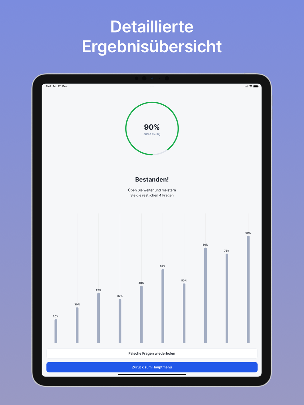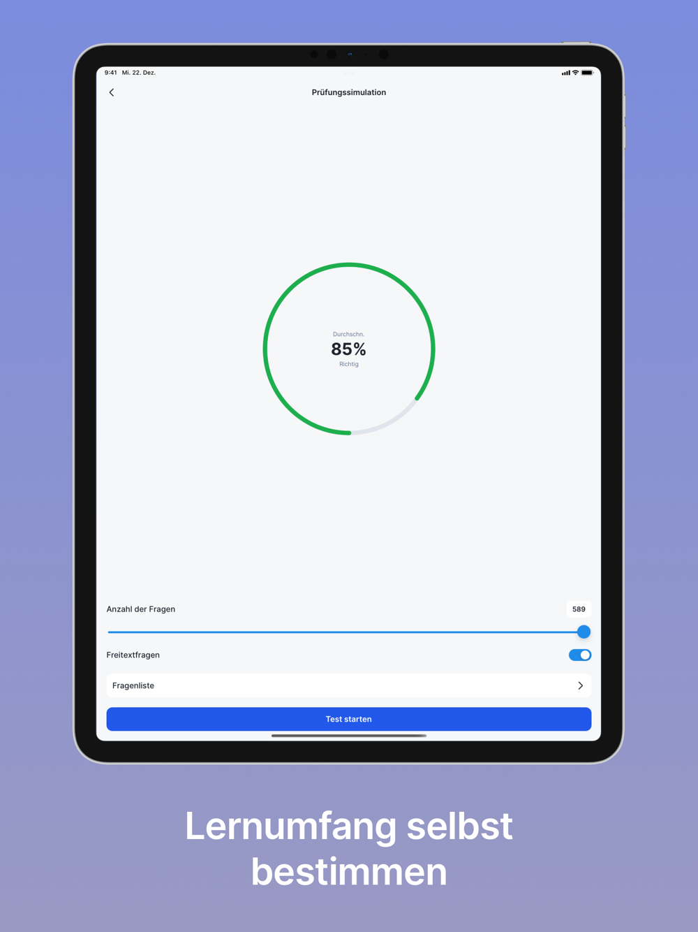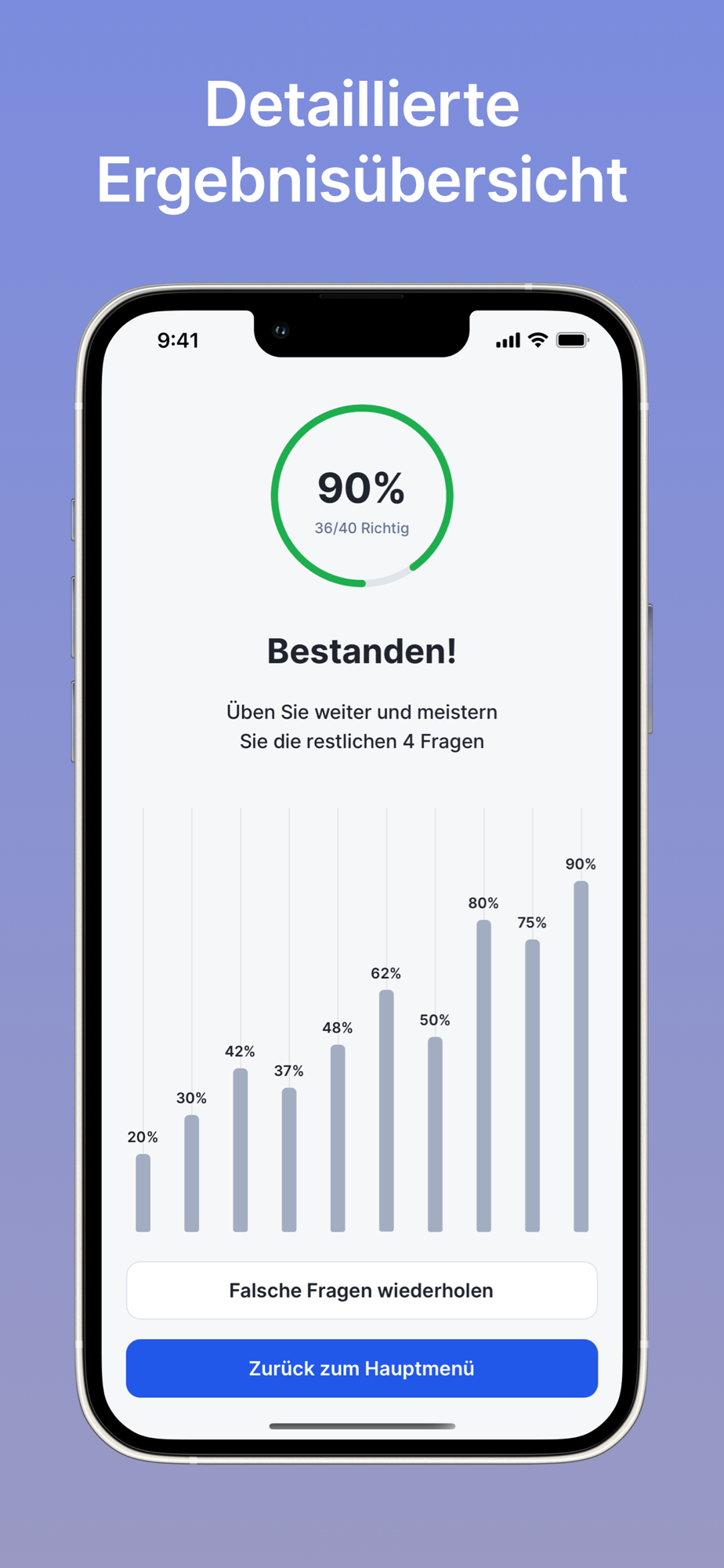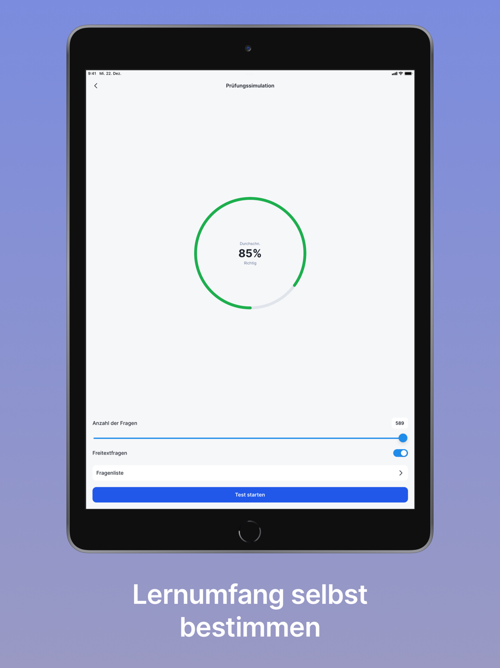 - Prüfungssimulation mit Bestehensgrenze - Diese App verwendet ein System zur Auswertung der Prüfungssimulation, welches über das Bestehen oder Durchfallen entscheidet. Dieses System wird von zertifizierten Prüfern bei echten Prüfungen verwendet.