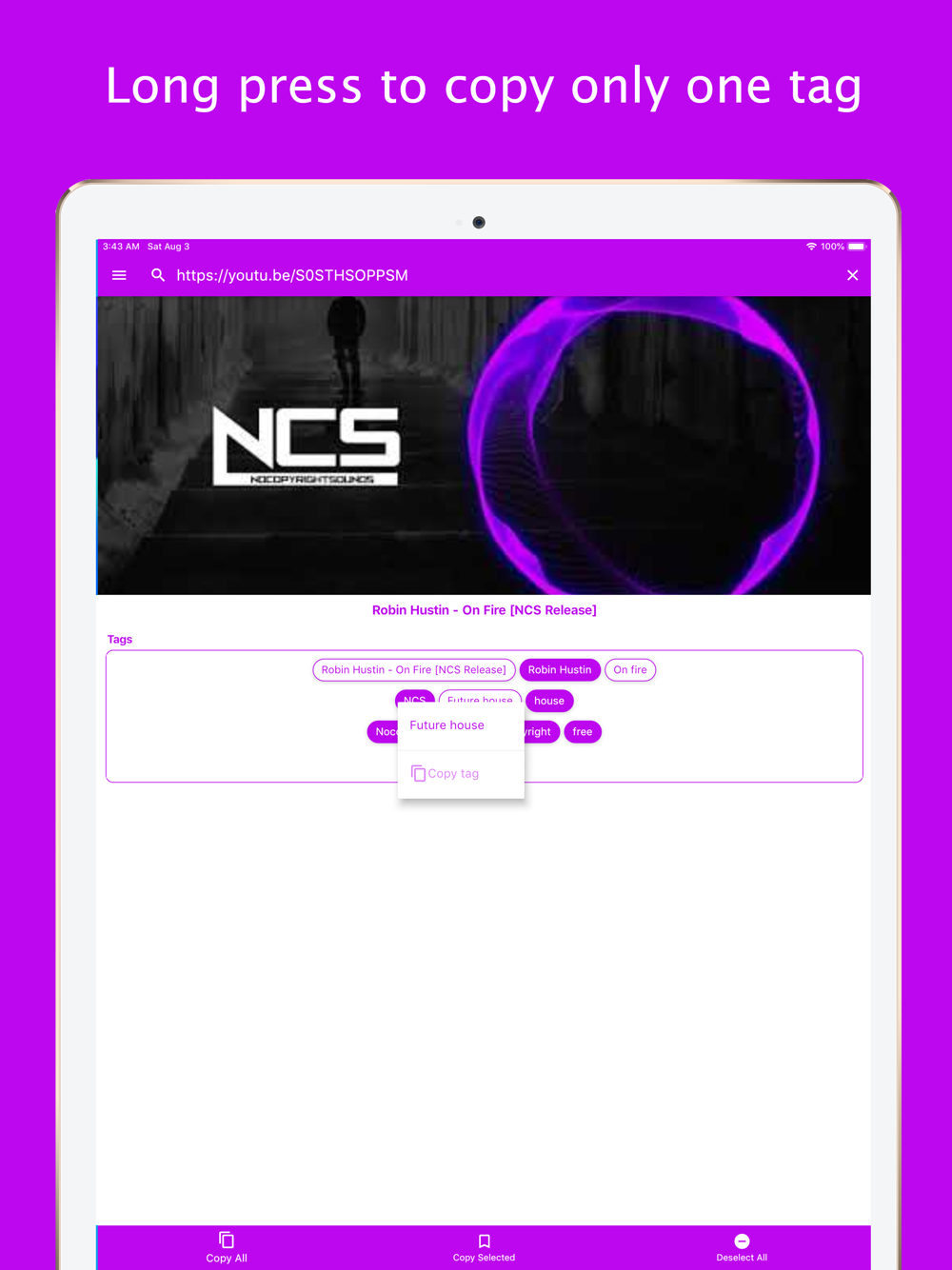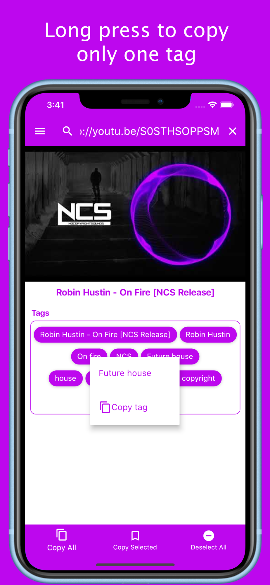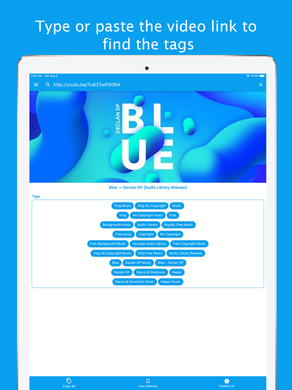 Using the application is very simple. Press the search button and type or paste the video link into the search field. When you run the search, the video tags will be displayed. These tags can be selected and copied to be used in your channel videos. In addition to that also it is possible select and copy a tag individually doing a long click over it.