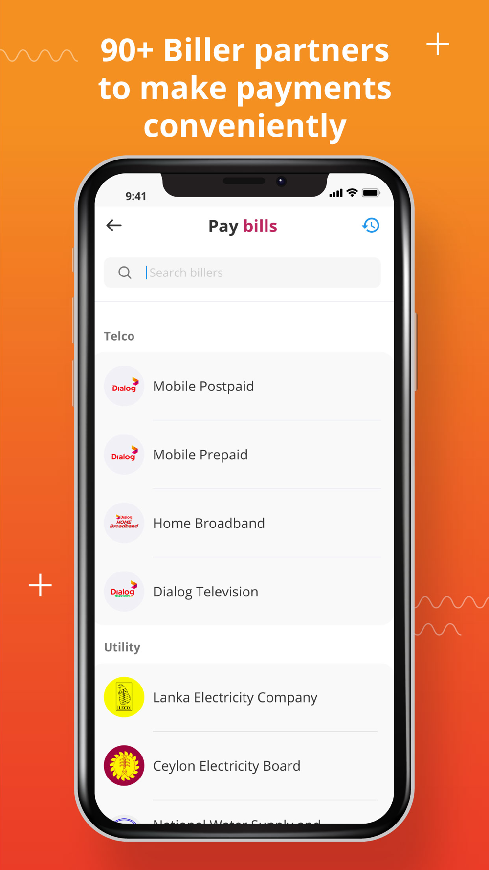 Pay to over 90+ billers conveniently and pay all your bills in one go. You can check the outstanding bill value for all your Dialog bills before you pay. Pay your Utility bill payments, Leasing payments, Mobile bill payments & reloads, Membership club payments, Insurance payments and many more.