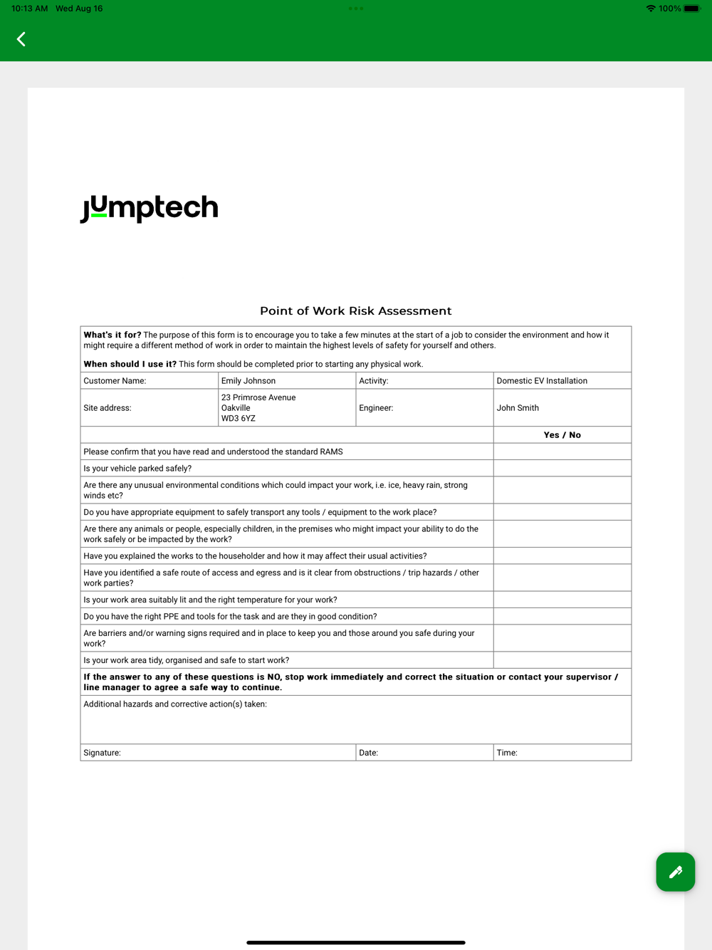 An app for electrical installers on Jumptech’s low-carbon technology installation platform. Execute tasks from Jumptech’s back-office workflow management system with checklists, photos and signature capture.