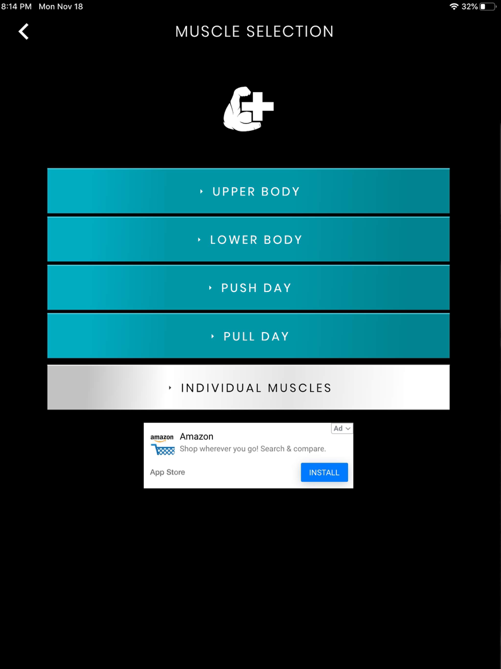 Users start be selecting the muscles they want to train. For instance, let's say you want to do a push day (shoulders, chest & triceps). Select 'PUSH DAY' on the muscle family screen. Or, if you want to do a push day but add in abs, select 'INDIVIDUAL MUSCLES' and then add all four muscles.