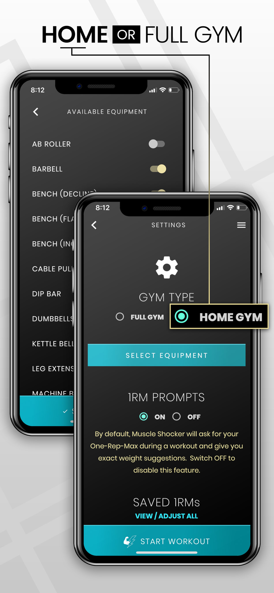 Firstly, in the settings you can select home or full gym. For home gym users you will be able to select the equipment you have available.