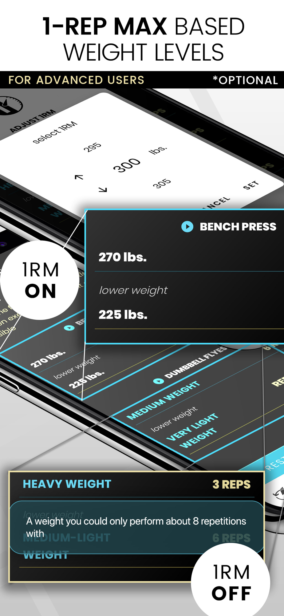 - By default the app will ask you for your one-rep max prior to each exercise. If you know it, enter it. If not, skip it. The weight levels given will be exact poundage if the 1RM is entered. Otherwise you will be given prompts such as "HEAVY WEIGHT". Tap on that prompt for a detailed description such as "A weight you could normally perform 8 repetitions with."