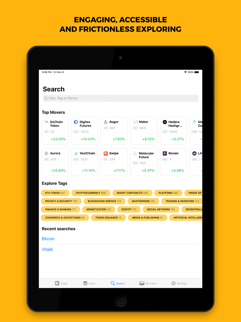 With COINS, you can Discover, Store, Invest, Send & Receive over 1500 cryptocurrencies. All in one app. Without Borders.