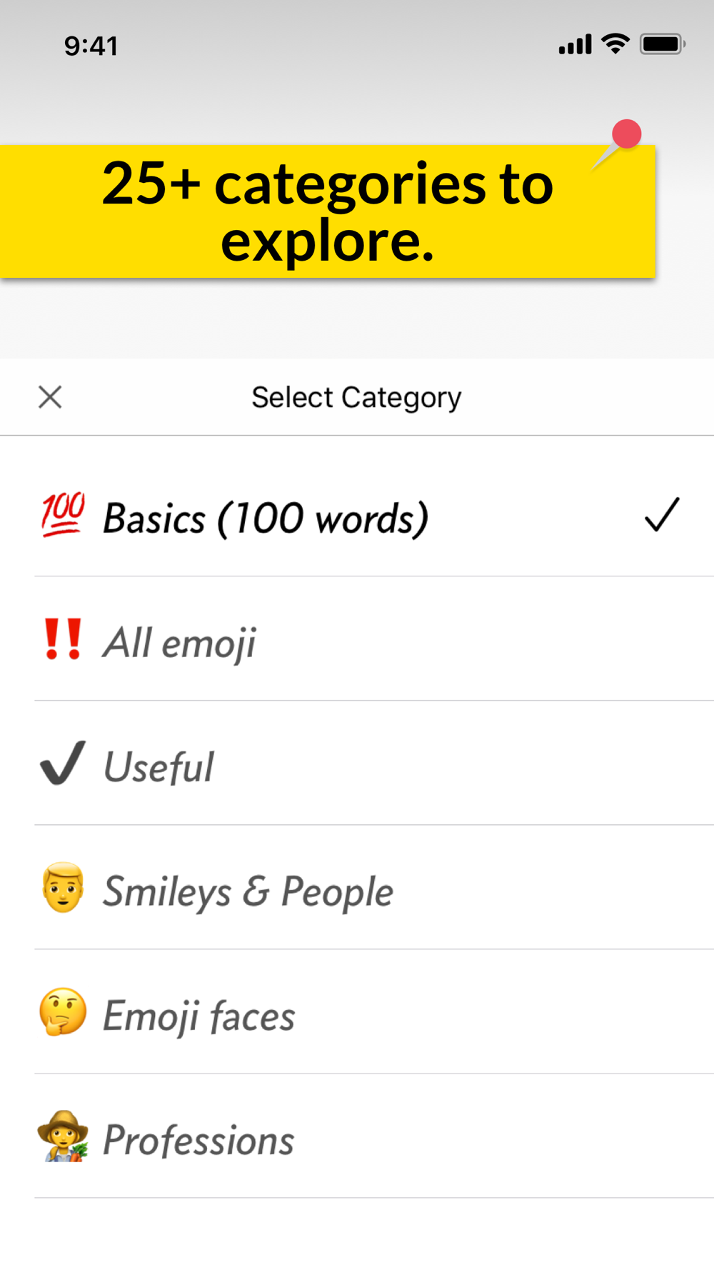 Learn words organized into these dictionary categories: "Useful", "Smileys and People", "Professions", "Emoji faces", "Gestures", "Day", "Night", "Time", "Old technology", "Related to phones", "Animals and Nature", "Holidays", "Travel and Places", "Africa", "North and South America", "Europe", "Asia and Oceania", "Activity", "Roger Federer", "Love", "Crime", "Numbers", "Food and Drink", "Breakfast", "Objects", "At the office", "Zodiac signs", "Symbols" and "Population".
