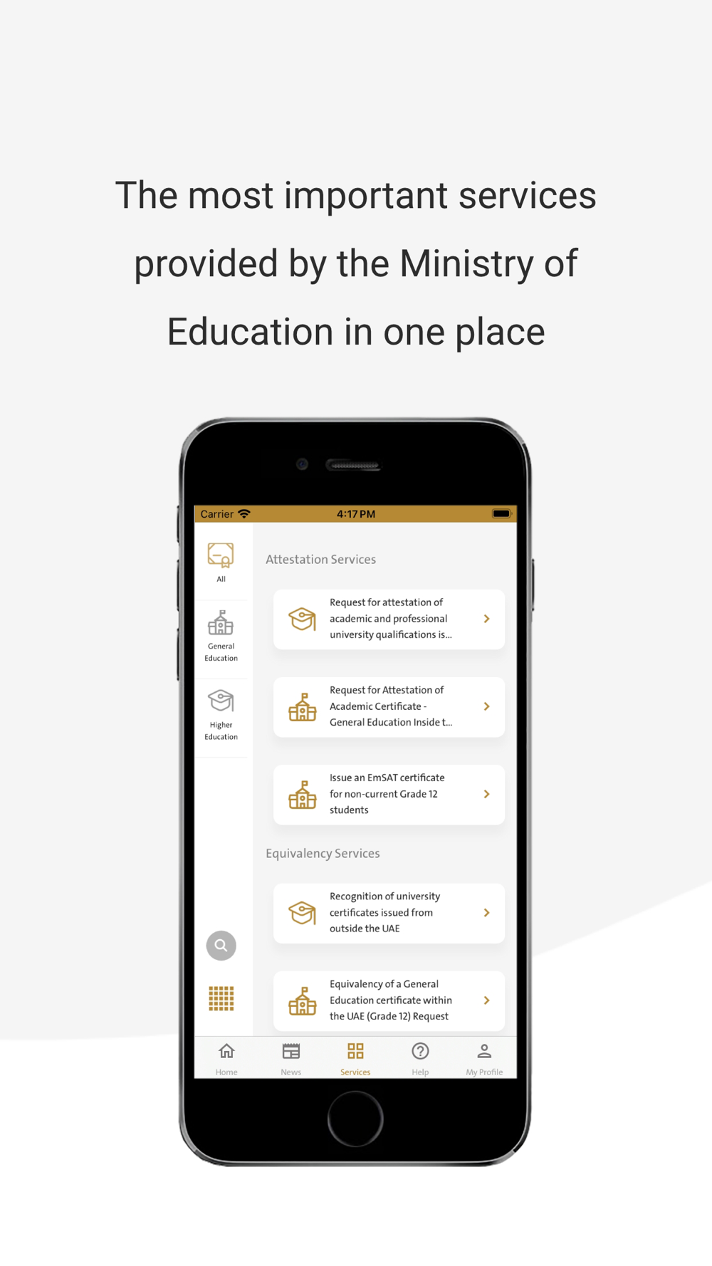 MOE mobile app is a channel for the public to benefit of the e-Services provided by the Ministry of Education. Through its user-friendly interface, you can request services related to both Higher Education and General Education (eg. Attestation Services, Certificate equivalency services, Apply for scholarship service, verify the authenticity of equivalency or attestation of certificates, Inquiries, Suggestions, and Complaints features) among other various services.
