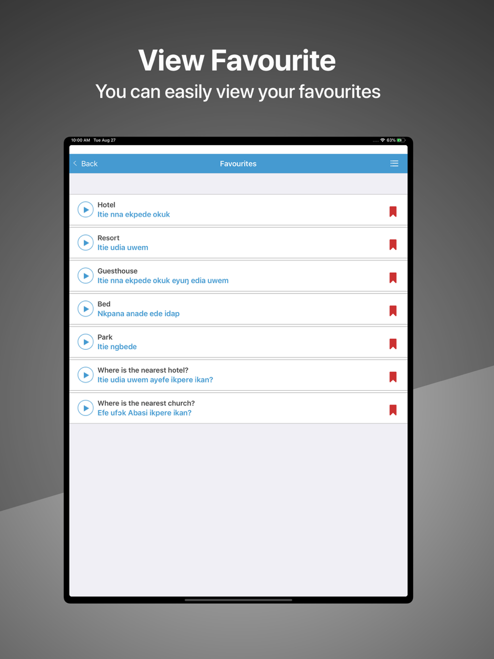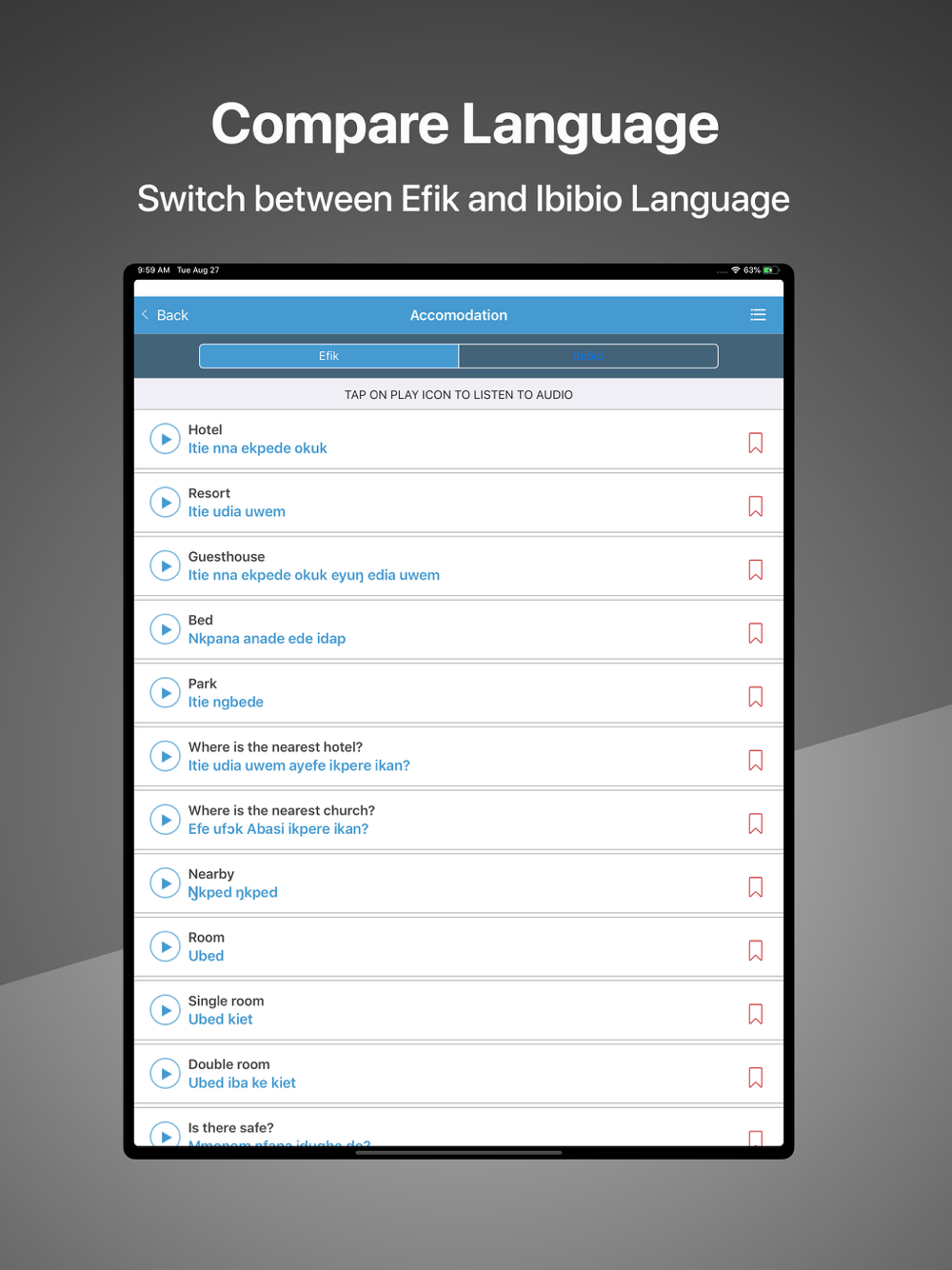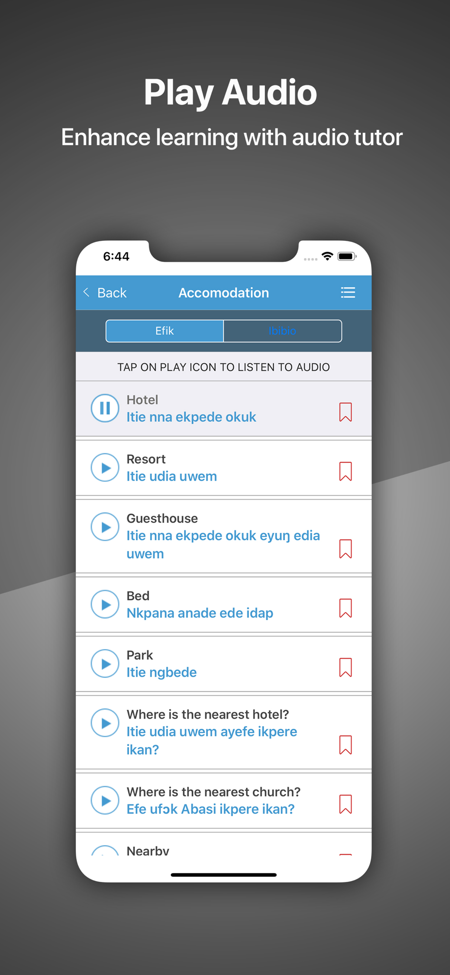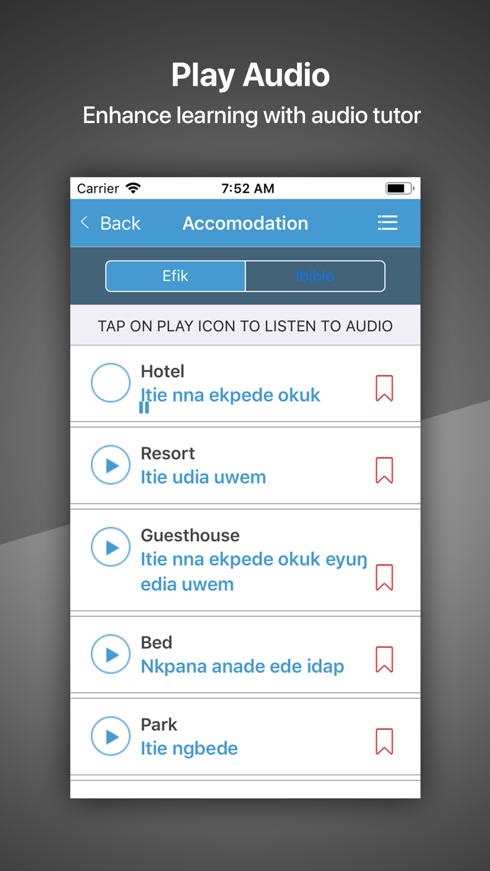 Speak Efik/Ibibio mobile app is designed to teach you how to speak Efik and Ibibio language. The app design is structured to enable you to listen to the pronunciation and text transcription of each word or sentence. It can be fun to learn a new language.